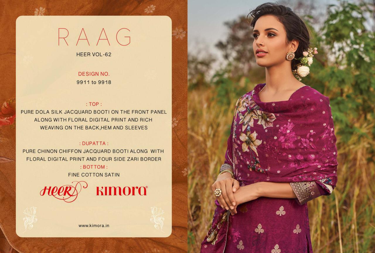 Brand - Kimora Heer . Catlog Name - RAAG HEER VOL -62. Rate -2475 per pcs . Series -9911 to 9918. Set to set. GST 5 Percent Extra. Single Extra 100 Delivery 5-6 days |