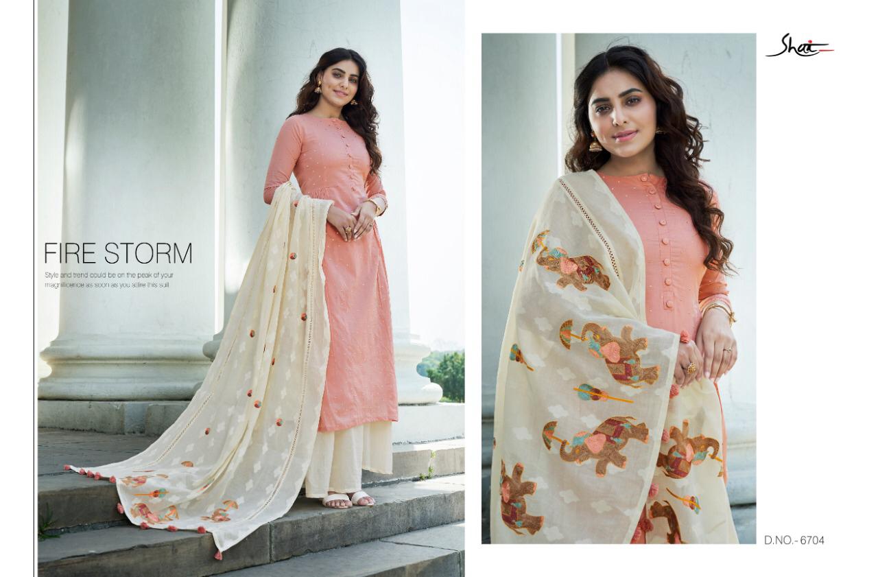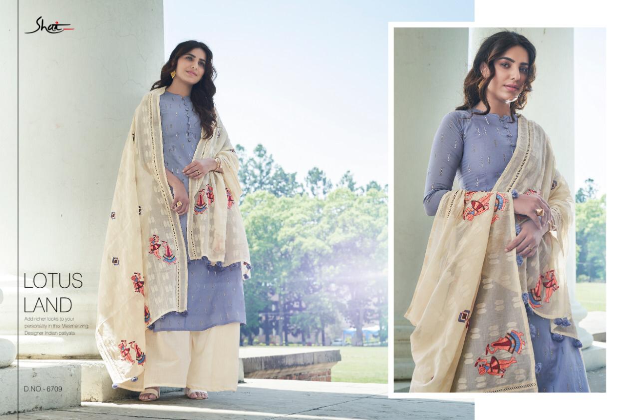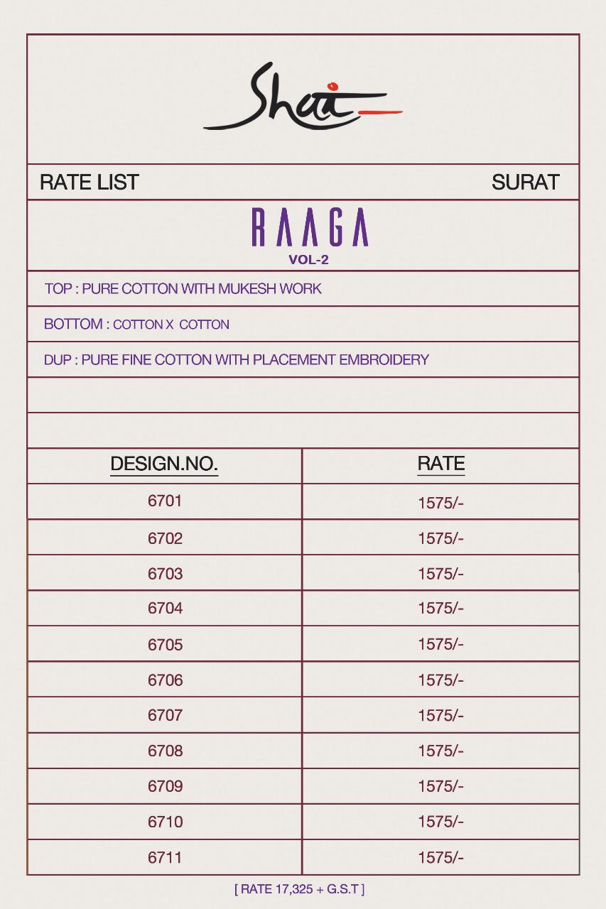 Brand - Shai Catlog name - RAAGA VOL -2. 11 Designs Singal Colour Fabric Details Top = Pure Cotton With Mukesh Work(Semi-Stich) Bottom = Cotton Ã? Cotton Dupatta = Pure Fine Cotton With Placement Embroidery Total pieces = 11 Rate = 1575/- Delivery 6 days later . Set To Set . GST 5 Percent Extra |