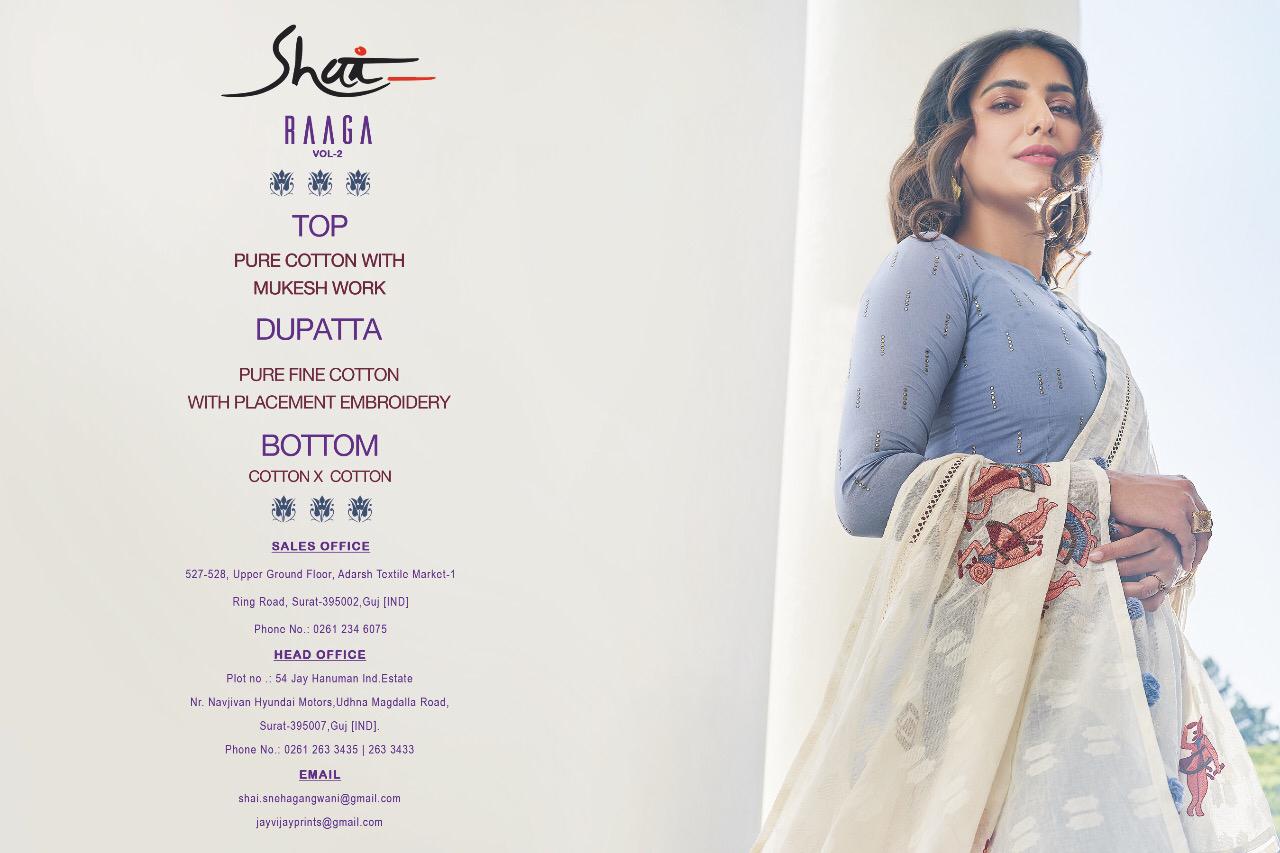 Buy Online Raaga Vol 2 By Shai Cotton Worked Suits Wholesale Supplier Gujarat 11 Pcs of Full Catalogue at Wholesale Price. Looking for Raaga Vol 2 By Shai Cotton Worked Suits Wholesale Supplier Gujarat Full Catalouge at Best Price? Buy Now Raaga Vol 2 By Shai Cotton Worked Suits Wholesale Supplier Gujarat at Wholesale Rate of Rs 17325 with Total 11 Pcs from authroized dealer and supplier of SHAI Brand. Cost of Each piece is just only Rs 1575 which is very low and affordable price to resale the product in your retail store ,This is Surat based Wholesale Supplier & Dealer of SHAI Brand. Click on Brand name to Know more about SHAI Brand's products.Call or Whatsapp on 9898838984 for booking or enquiry