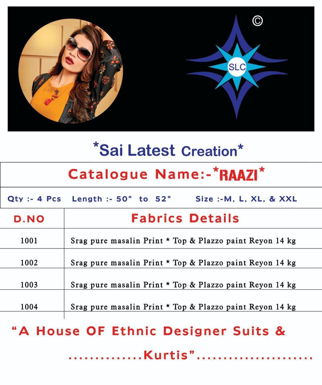 Buy Online Raazi By Slc Musline Printed Western Wear Wholesale Supplier Gujarat 4 Pcs of Full Catalogue at Wholesale Price. Looking for Raazi By Slc Musline Printed Western Wear Wholesale Supplier Gujarat Full Catalouge at Best Price? Buy Now Raazi By Slc Musline Printed Western Wear Wholesale Supplier Gujarat at Wholesale Rate of Rs 2980 with Total 4 Pcs from authroized dealer and supplier of Brand. Cost of Each piece is just only Rs 745 which is very low and affordable price to resale the product in your retail store ,This is Surat based Wholesale Supplier & Dealer of Brand. Click on Brand name to Know more about Brand's products.Call or Whatsapp on 9898838984 for booking or enquiry