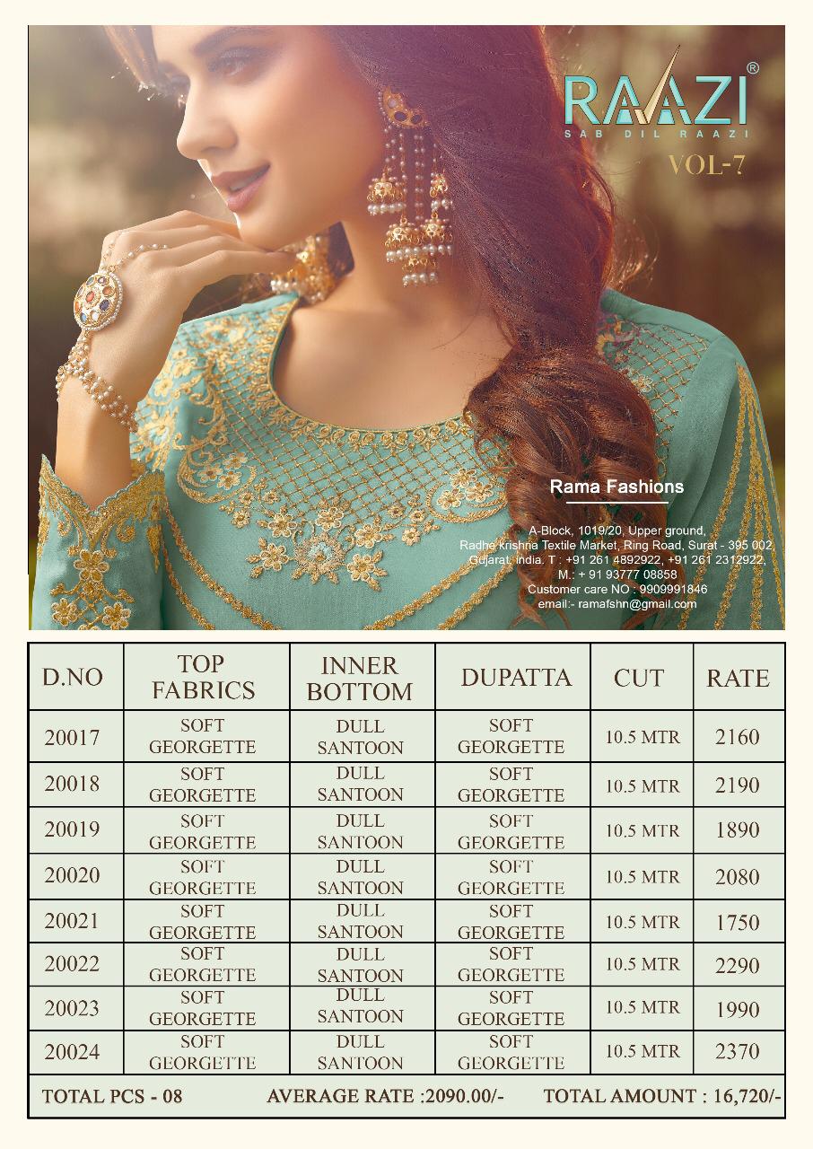 Buy Online Raazi Vol 7 By Rama 20017 Series Fancy Soft Georgette Party Wear Gown Suit Collection Wholesale Dealer Surat 8 Pcs of Full Catalogue at Wholesale Price. Looking for Raazi Vol 7 By Rama 20017 Series Fancy Soft Georgette Party Wear Gown Suit Collection Wholesale Dealer Surat Full Catalouge at Best Price? Buy Now Raazi Vol 7 By Rama 20017 Series Fancy Soft Georgette Party Wear Gown Suit Collection Wholesale Dealer Surat at Wholesale Rate of Rs 16720 with Total 8 Pcs from authroized dealer and supplier of RAMA FASHIONS Brand. Cost of Each piece is just only Rs 2090 which is very low and affordable price to resale the product in your retail store ,This is Surat based Wholesale Supplier & Dealer of RAMA FASHIONS Brand. Click on Brand name to Know more about RAMA FASHIONS Brand's products.Call or Whatsapp on 9898838984 for booking or enquiry