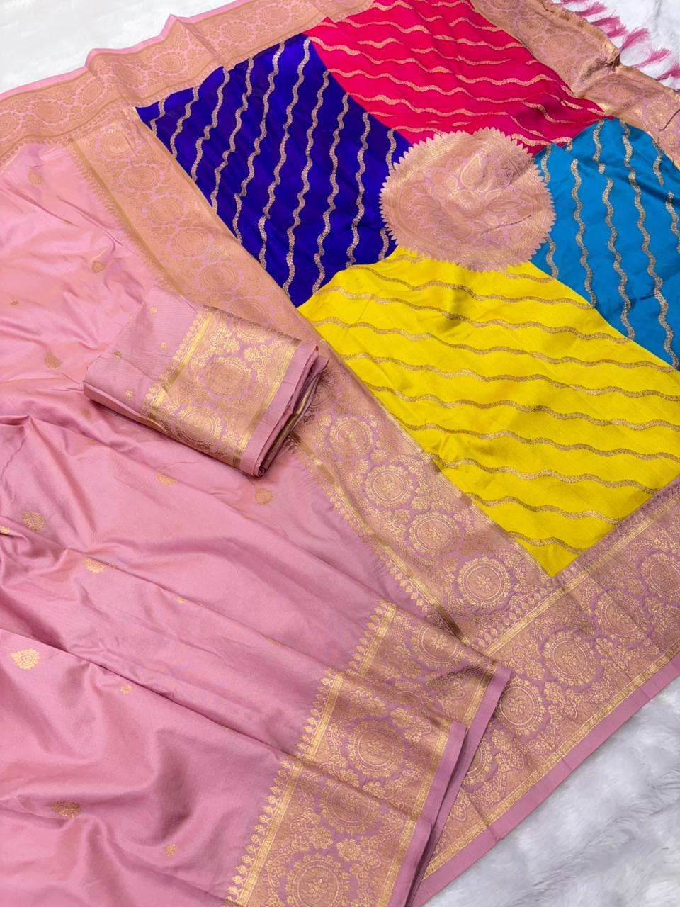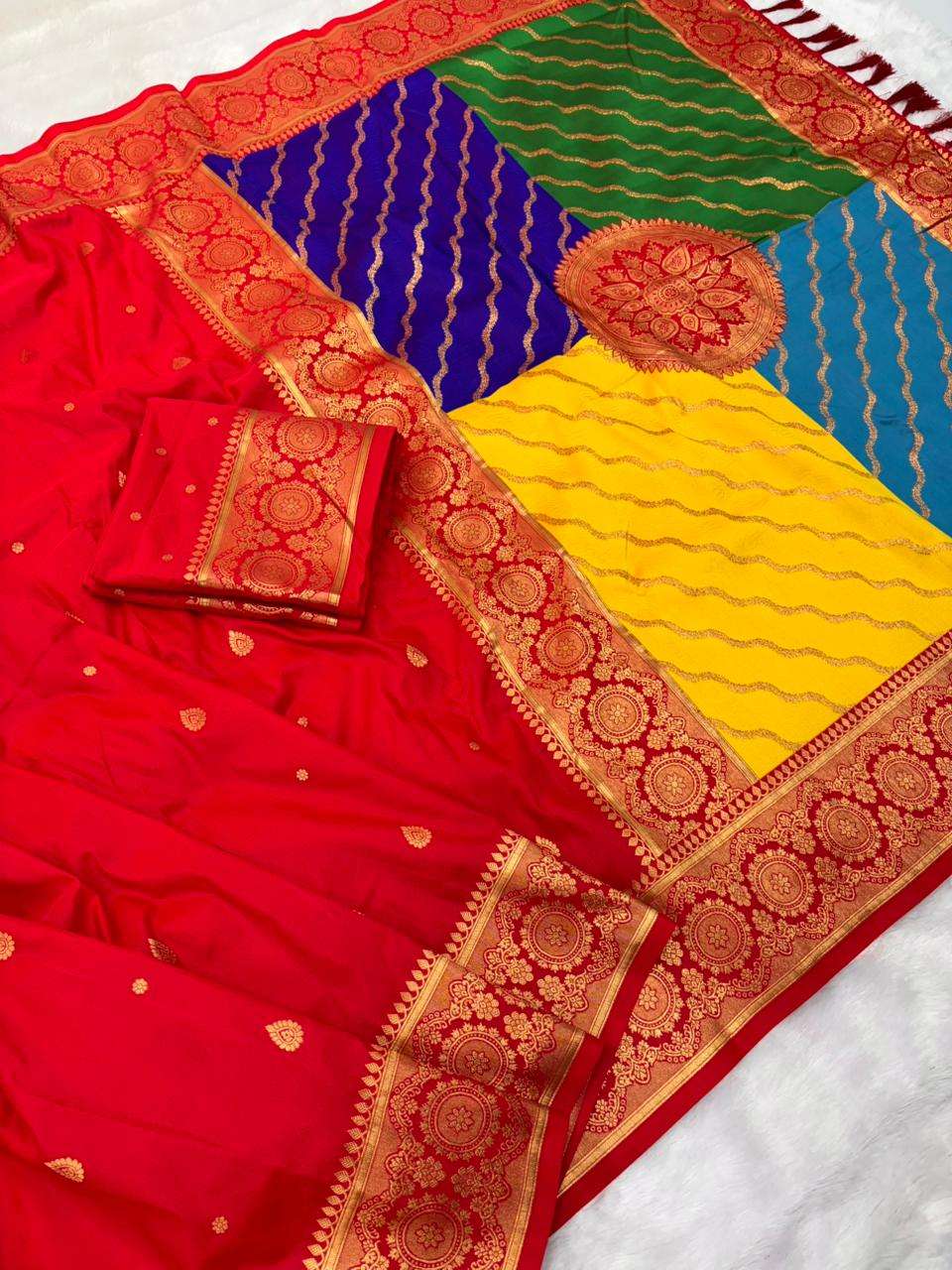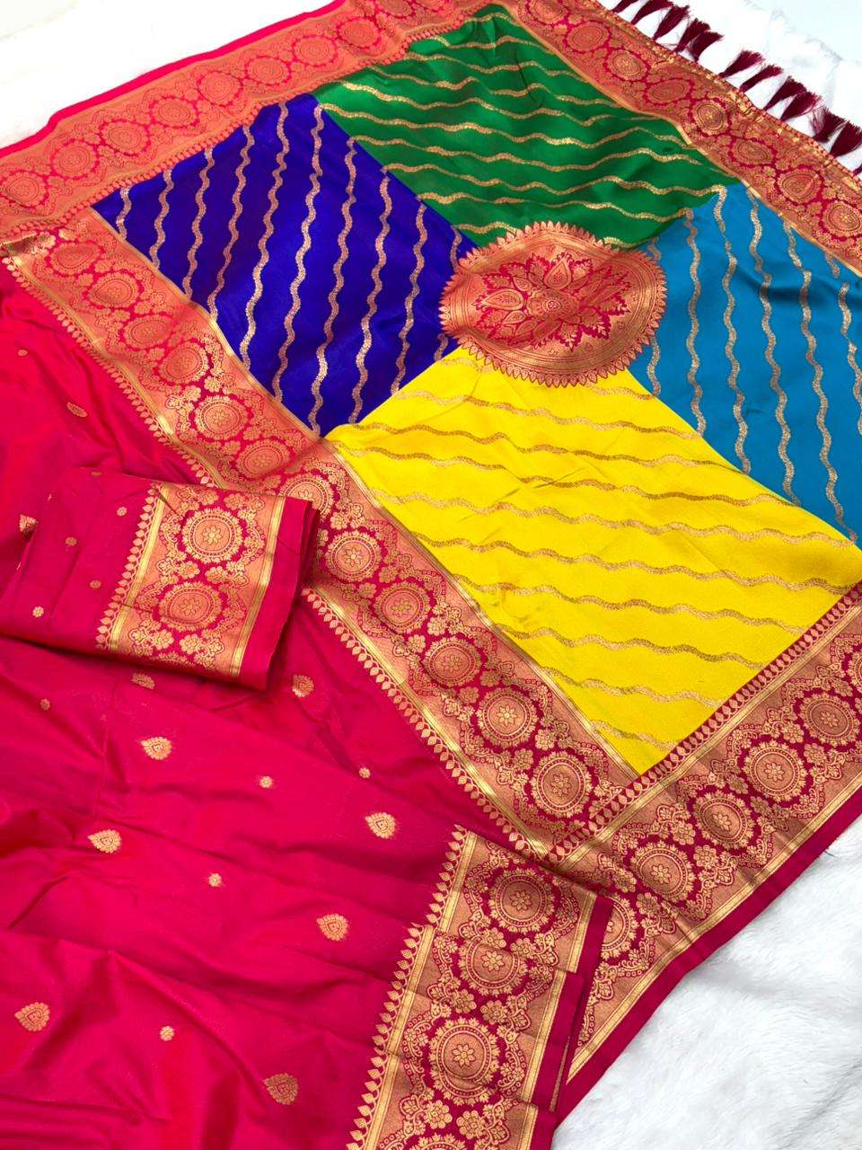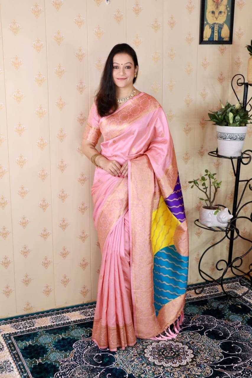 Premium Banarasi Soft Silk Sarees with gold zari motifs all over the body, having rich zari woven Rangkaat multicolor pallu and paired with brocade running Blouse