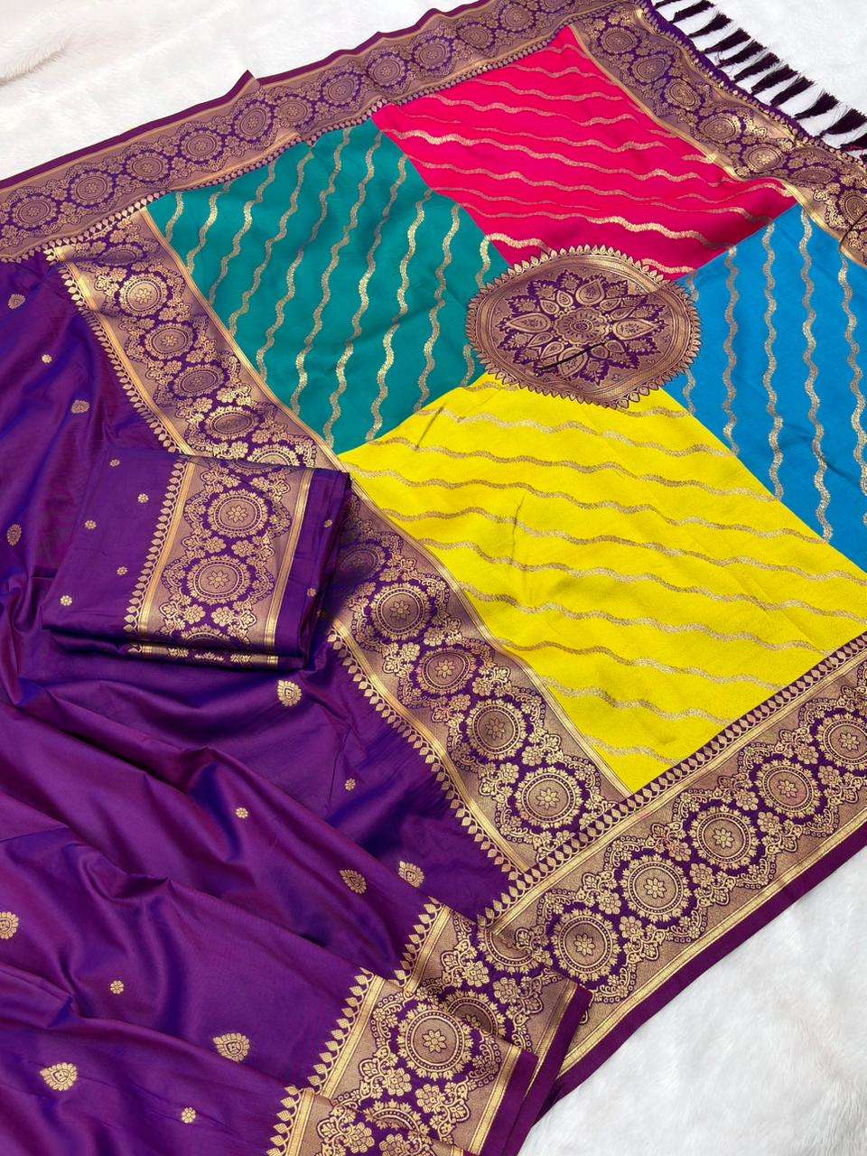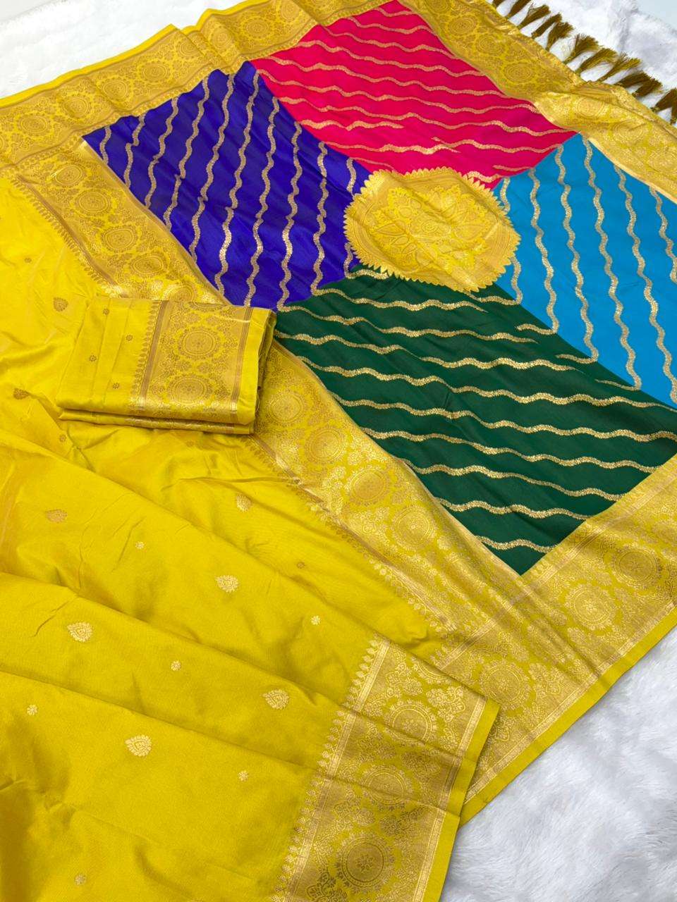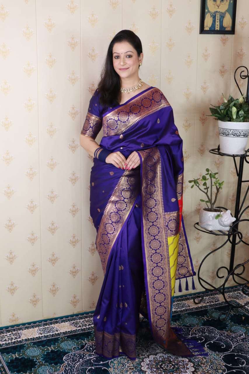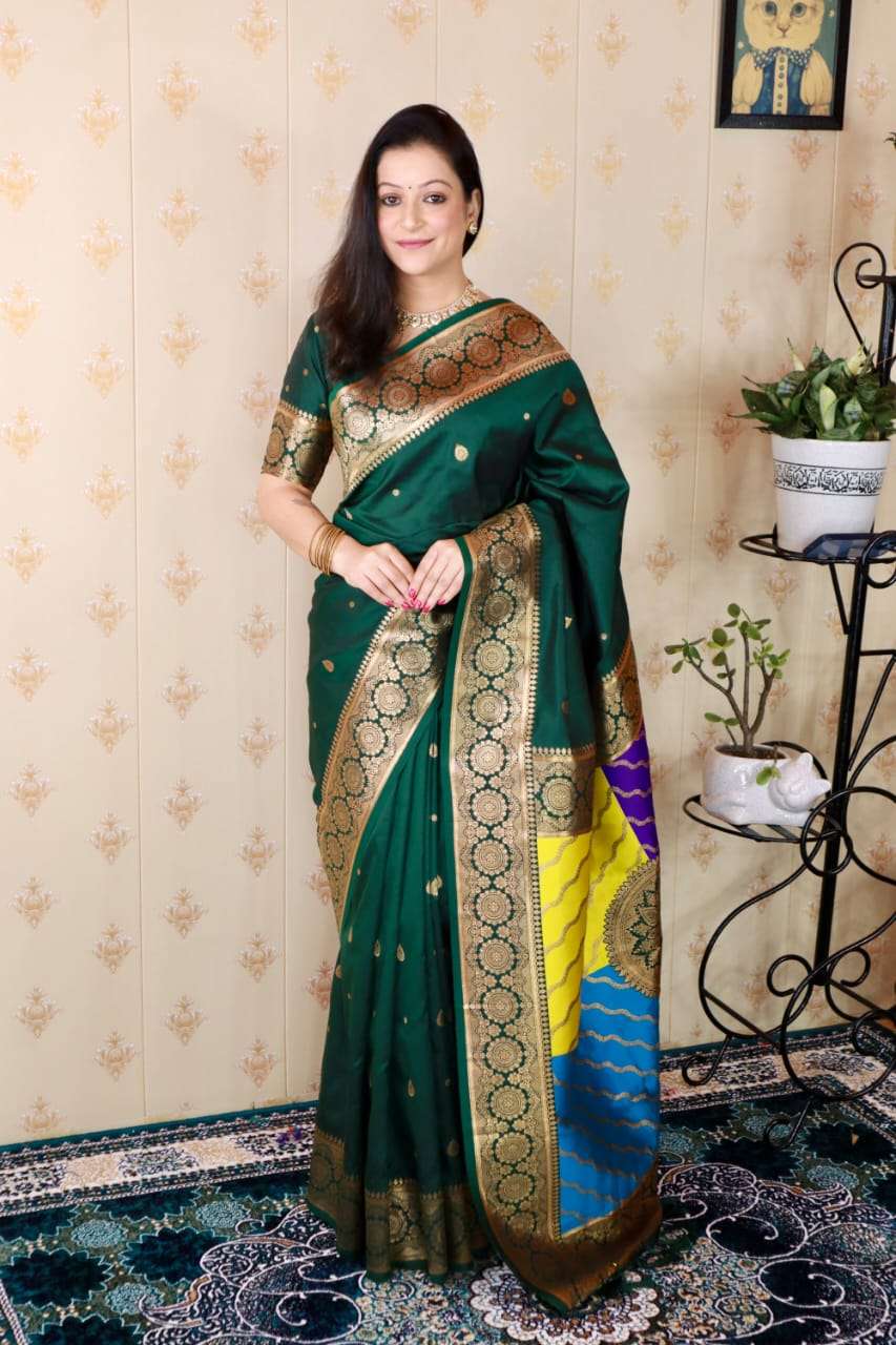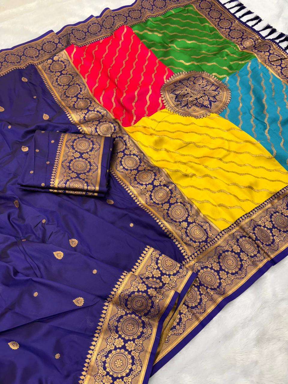 Premium Banarasi Soft Silk Sarees with gold zari motifs all over the body, having rich zari woven Rangkaat multicolor pallu and paired with brocade running Blouse