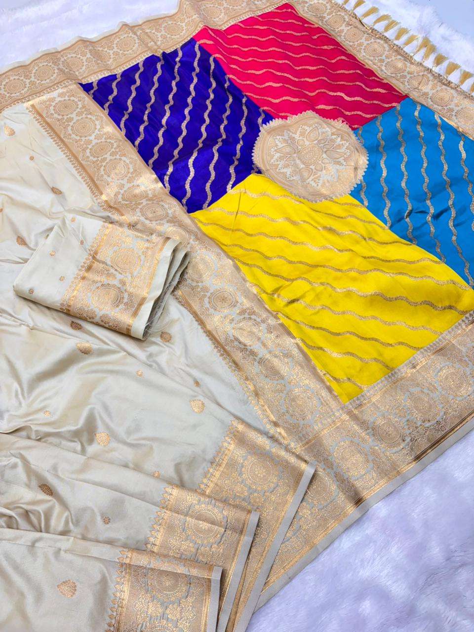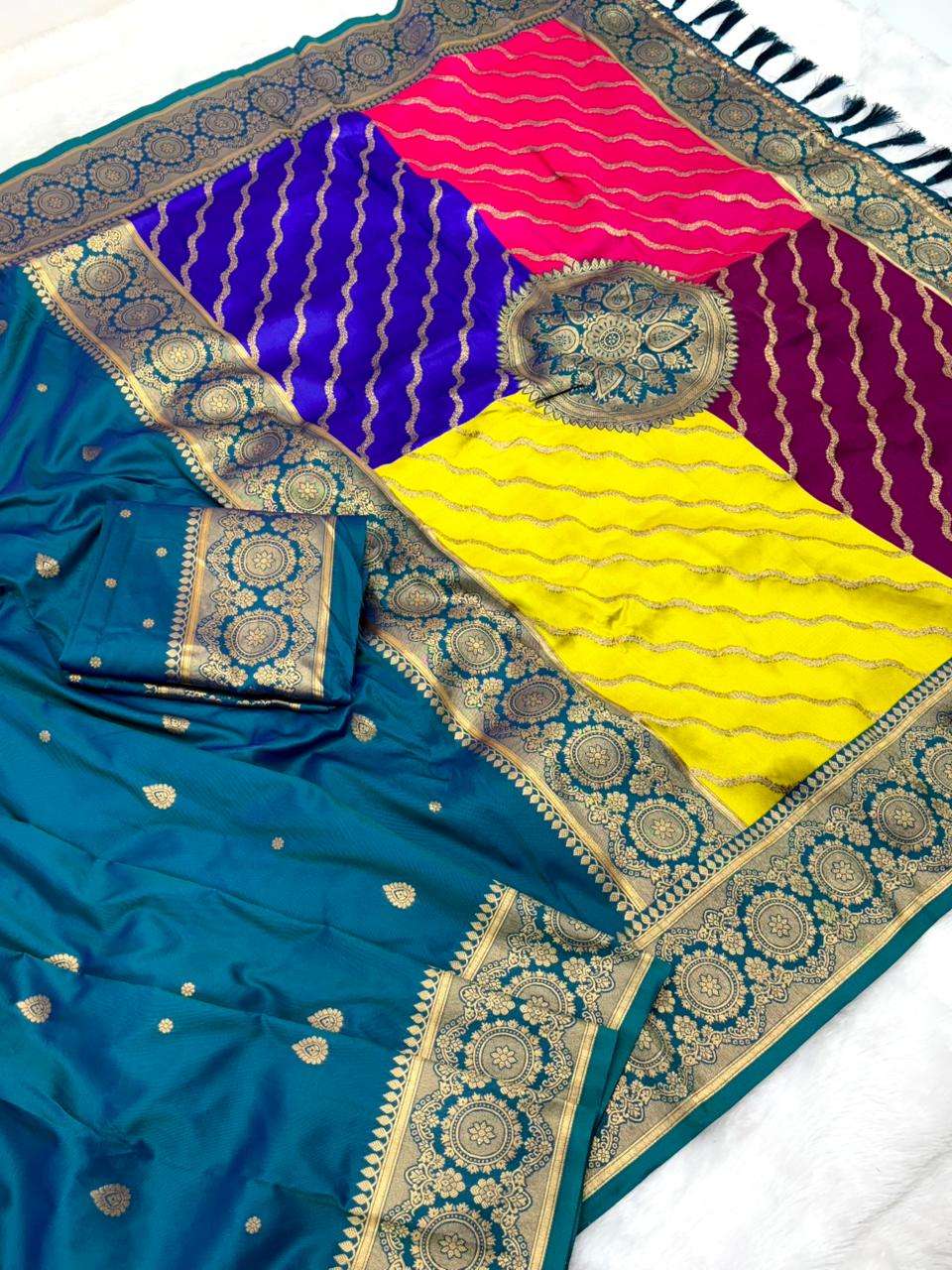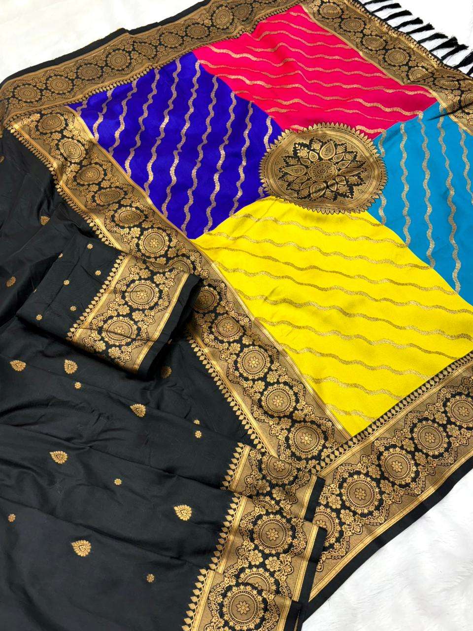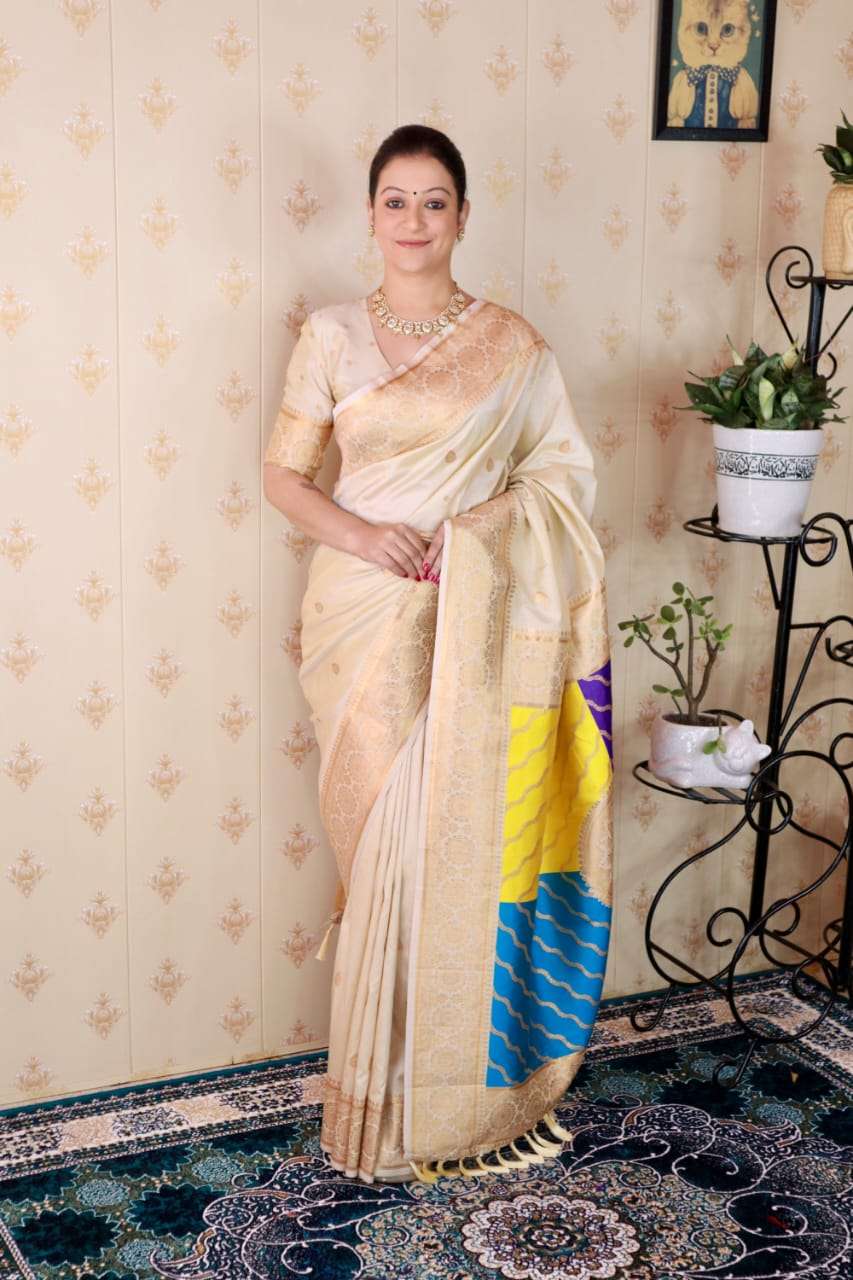 Premium Banarasi Soft Silk Sarees with gold zari motifs all over the body, having rich zari woven Rangkaat multicolor pallu and paired with brocade running Blouse
