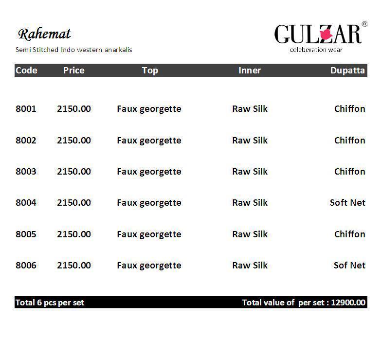 Buy Online Rahemat By Gulzar Series 8001 To 8006 Designer Party Wear Suits Wholesale Supplier Nd Dealer Gujarat 6 Pcs of Full Catalogue at Wholesale Price. Looking for Rahemat By Gulzar Series 8001 To 8006 Designer Party Wear Suits Wholesale Supplier Nd Dealer Gujarat Full Catalouge at Best Price? Buy Now Rahemat By Gulzar Series 8001 To 8006 Designer Party Wear Suits Wholesale Supplier Nd Dealer Gujarat at Wholesale Rate of Rs 12900 with Total 6 Pcs from authroized dealer and supplier of GULZAR Brand. Cost of Each piece is just only Rs 2150 which is very low and affordable price to resale the product in your retail store ,This is Surat based Wholesale Supplier & Dealer of GULZAR Brand. Click on Brand name to Know more about GULZAR Brand's products.Call or Whatsapp on 9898838984 for booking or enquiry