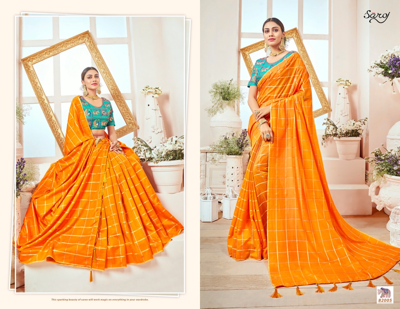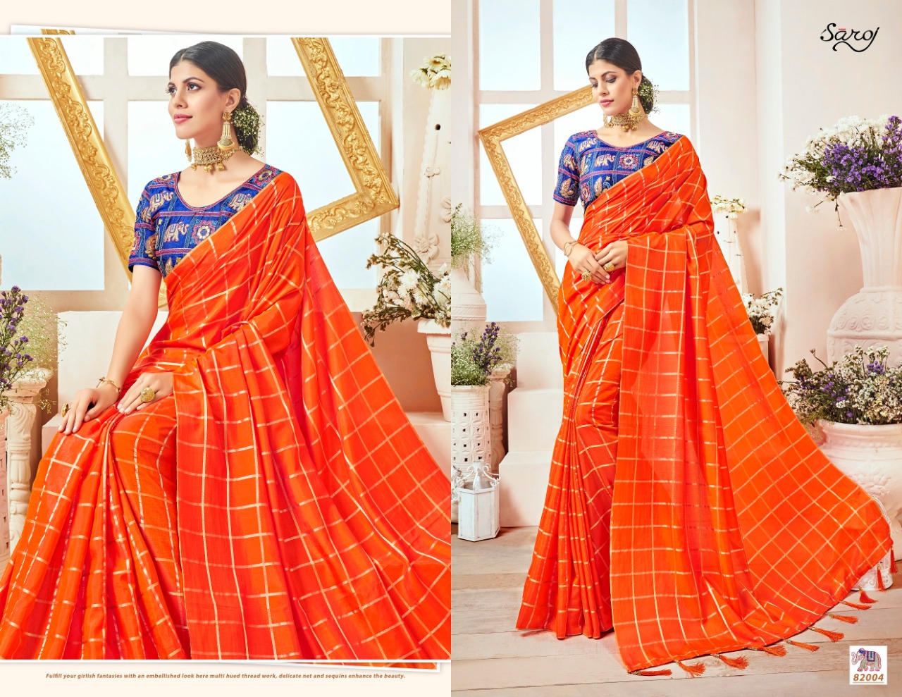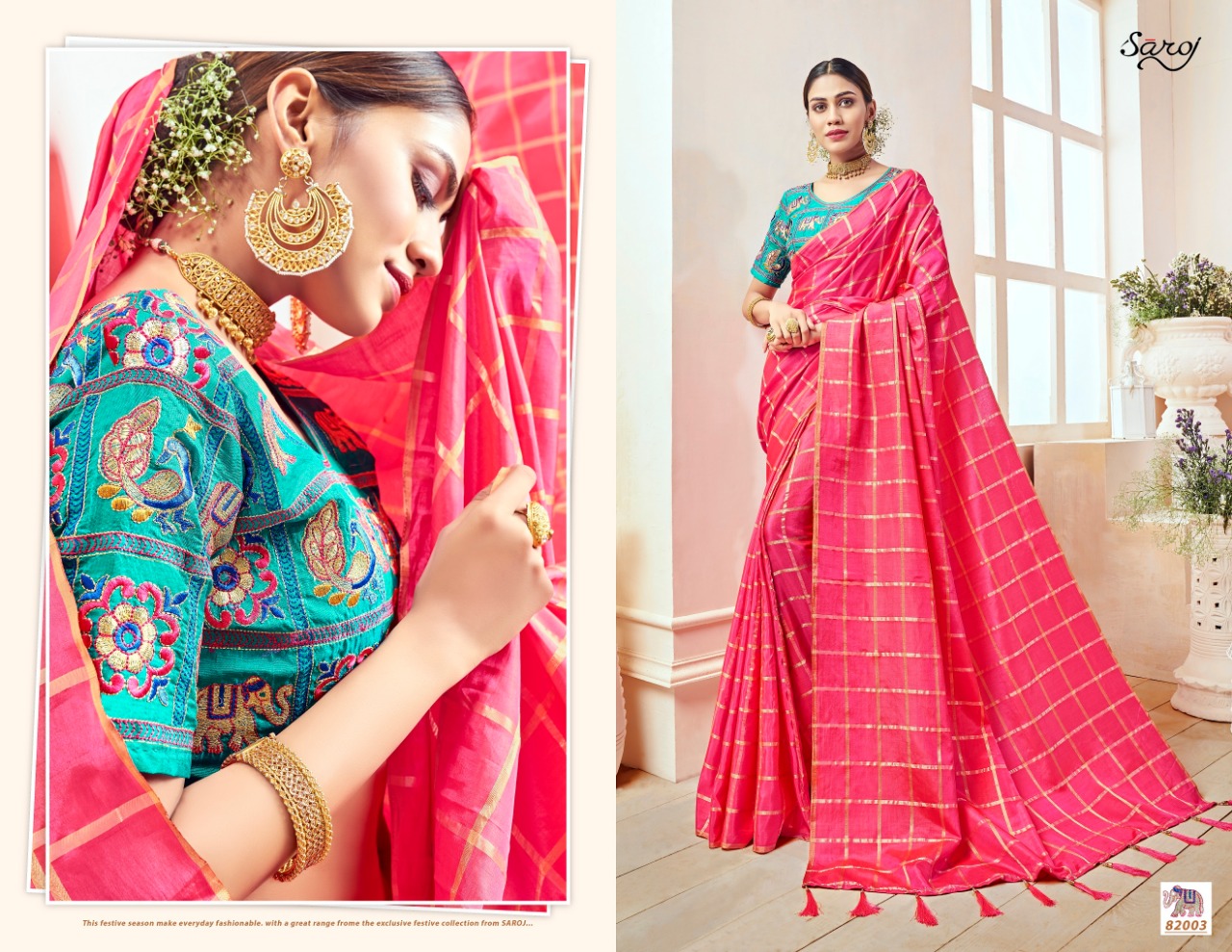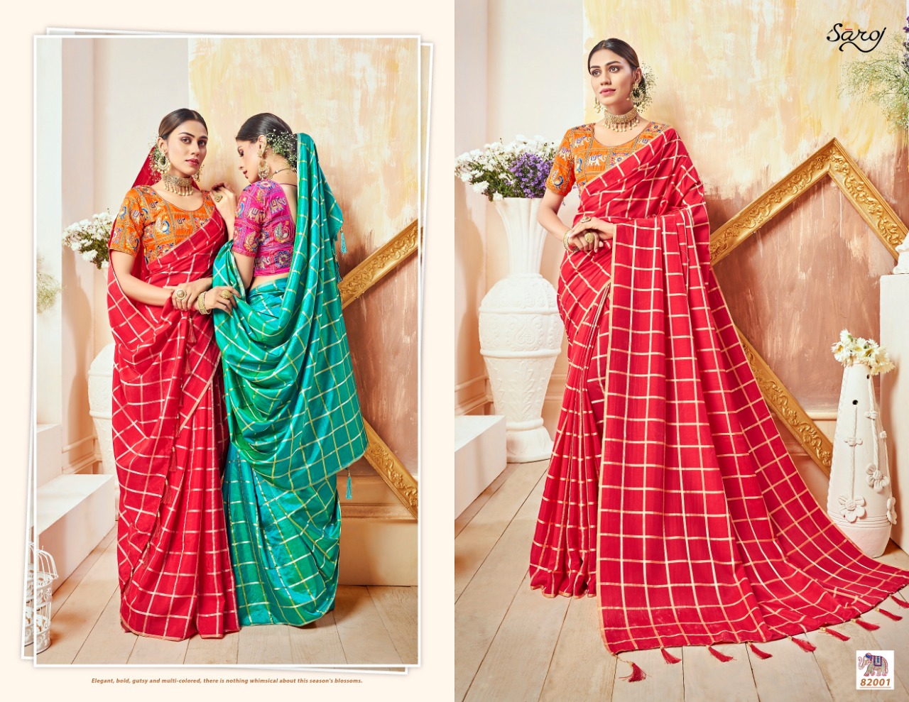 Buy Online Raj Kumari By Saroj 82001 Series Fancy Sana Silk Viscose Checks Saree Collection Wholesaler Surat 6 Pcs of Full Catalogue at Wholesale Price. Looking for Raj Kumari By Saroj 82001 Series Fancy Sana Silk Viscose Checks Saree Collection Wholesaler Surat Full Catalouge at Best Price? Buy Now Raj Kumari By Saroj 82001 Series Fancy Sana Silk Viscose Checks Saree Collection Wholesaler Surat at Wholesale Rate of Rs 6570 with Total 6 Pcs from authroized dealer and supplier of SAROJ SAREE Brand. Cost of Each piece is just only Rs 1095 which is very low and affordable price to resale the product in your retail store ,This is Surat based Wholesale Supplier & Dealer of SAROJ SAREE Brand. Click on Brand name to Know more about SAROJ SAREE Brand's products.Call or Whatsapp on 9898838984 for booking or enquiry
