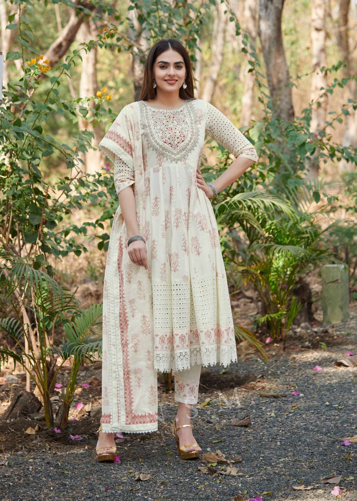 *TOP- HEAVY EMBROIDERY NACK WORK WITH PURE COTTON PRINT ANARKALI STYLE WITH SHIFFLI PANEL WORK*