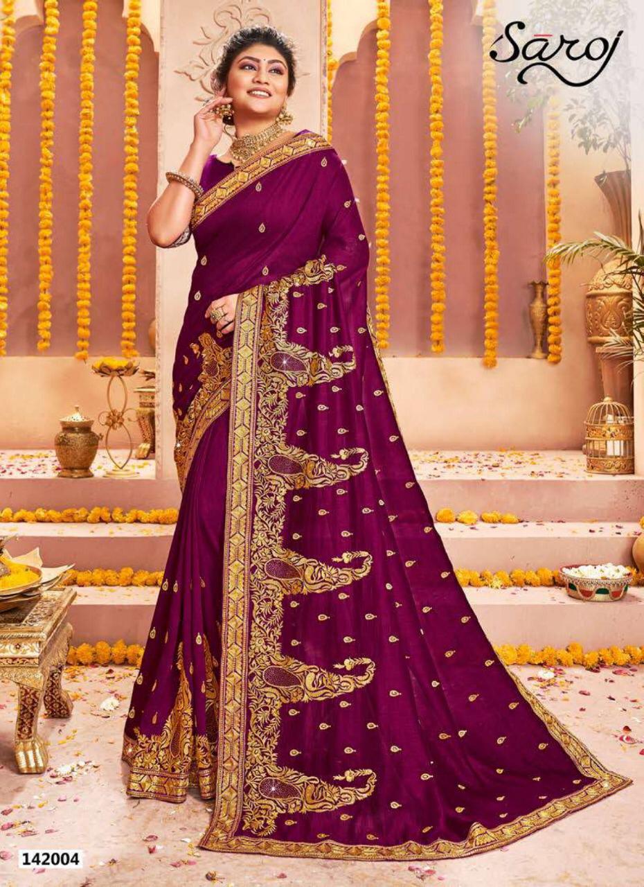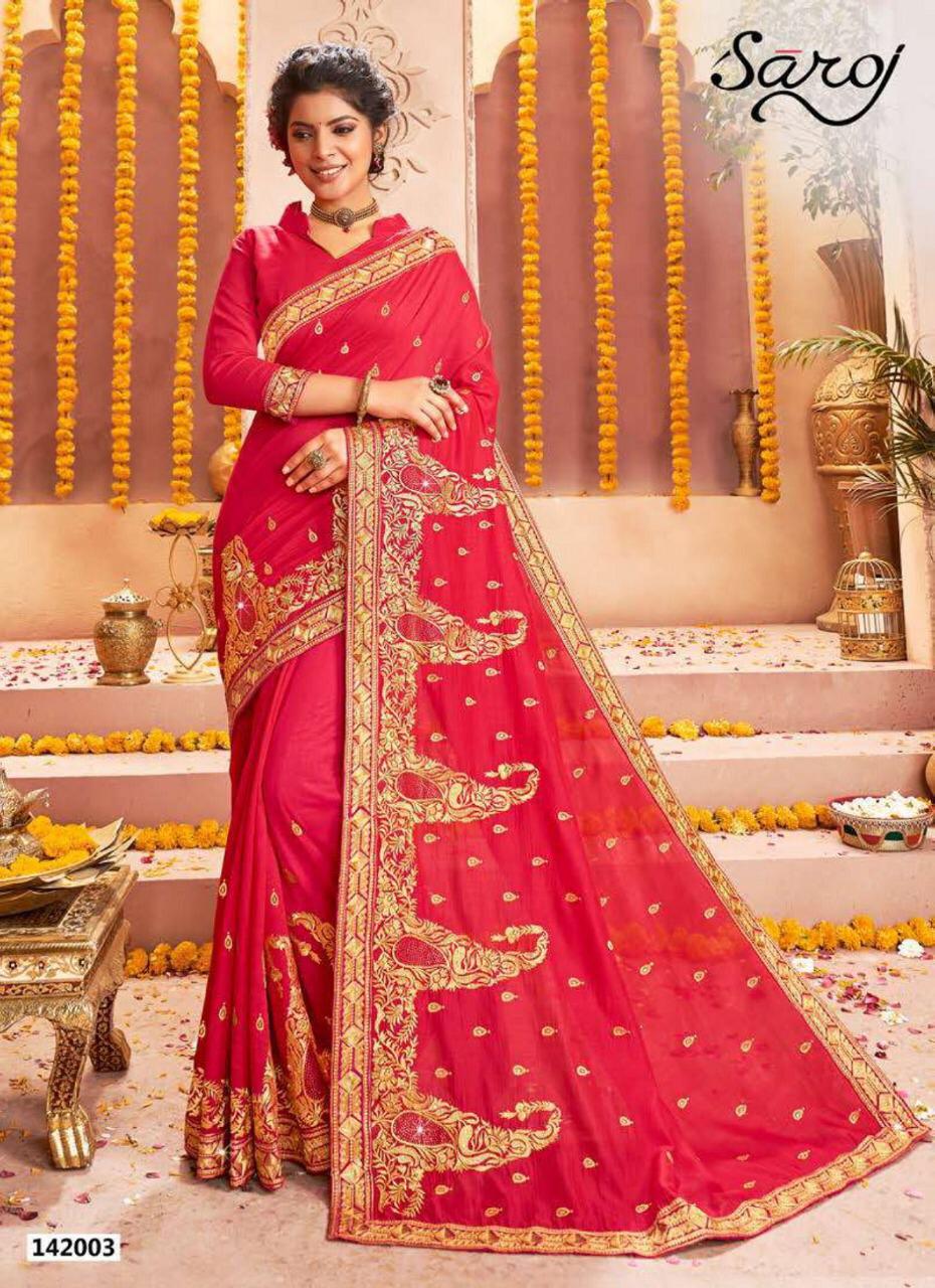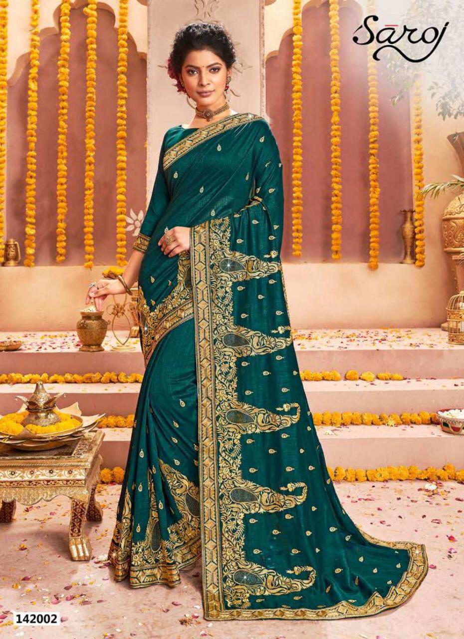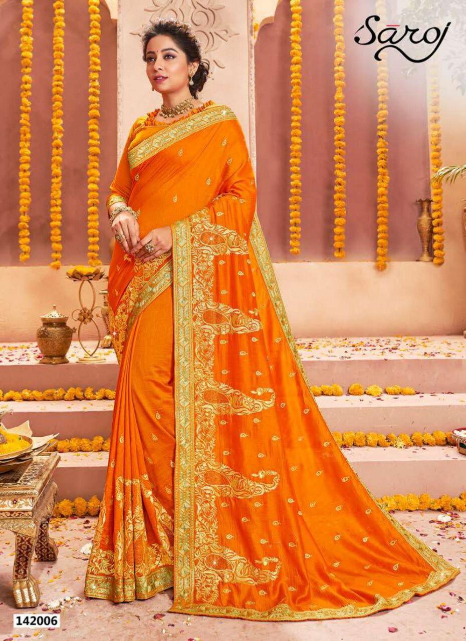 *Rajdhani by saroj * Rate- 1535 per Pcs . Fabric: P x C Vichitra silk with Jari work with Swarovski. Blouse: Vichitra silk. 6 Design in set. Set to set. Delivery from today |
