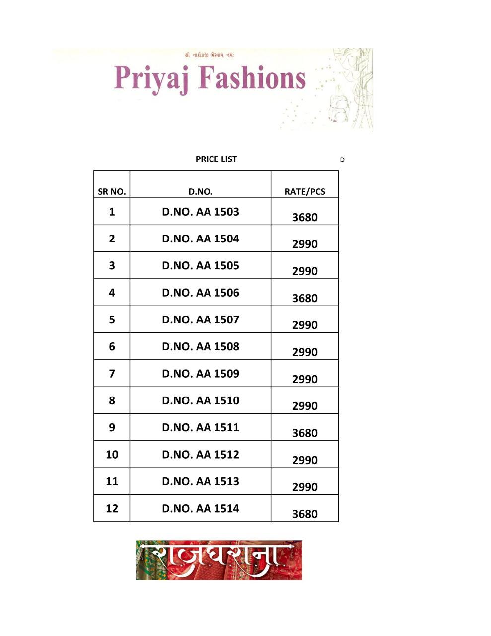 Buy Online Rajgharana Series Aa 1503 To Aa1514 By Priyaj Fashions Single Available Manufacturer Traders Surat 12 Pcs of Full Catalogue at Wholesale Price. Looking for Rajgharana Series Aa 1503 To Aa1514 By Priyaj Fashions Single Available Manufacturer Traders Surat Full Catalouge at Best Price? Buy Now Rajgharana Series Aa 1503 To Aa1514 By Priyaj Fashions Single Available Manufacturer Traders Surat at Wholesale Rate of Rs 0 with Total 12 Pcs from authroized dealer and supplier of Brand. Cost of Each piece is just only Rs 0 which is very low and affordable price to resale the product in your retail store ,This is Surat based Wholesale Supplier & Dealer of Brand. Click on Brand name to Know more about Brand's products.Call or Whatsapp on 9898838984 for booking or enquiry