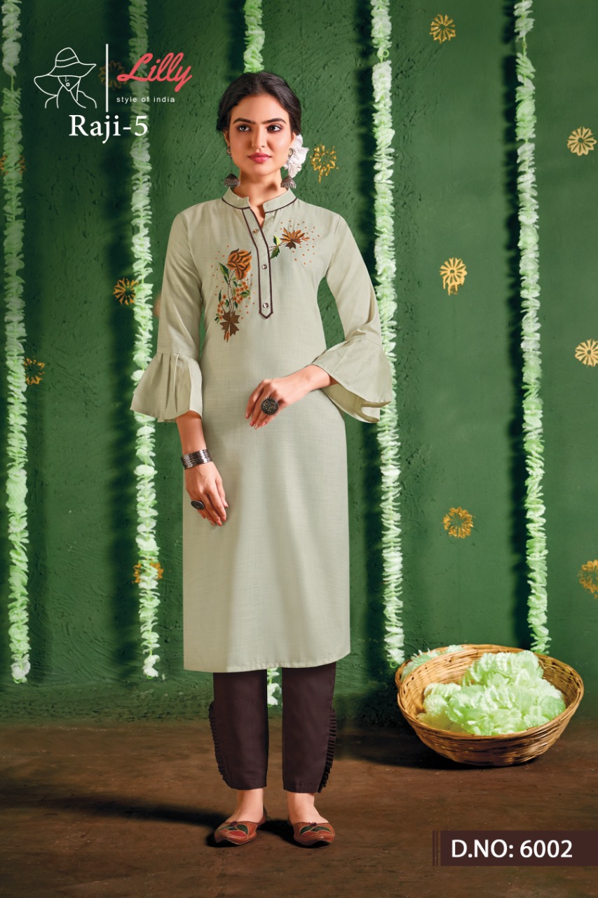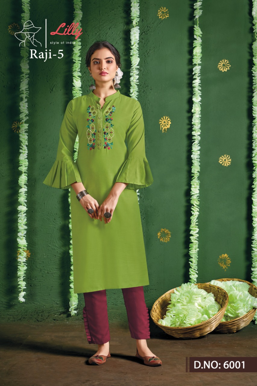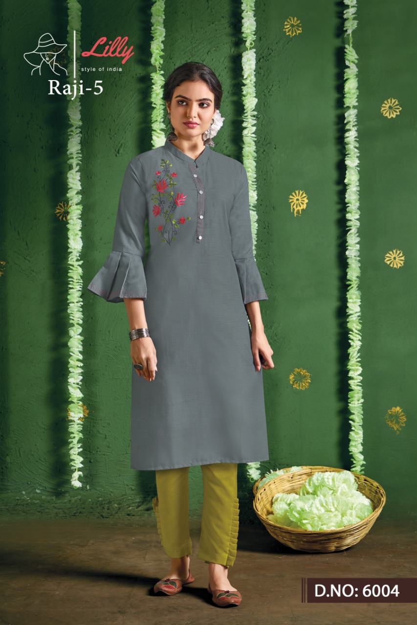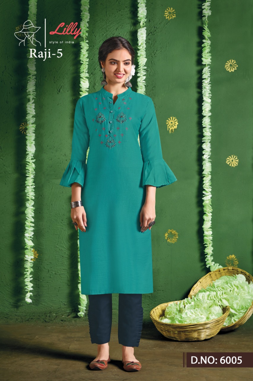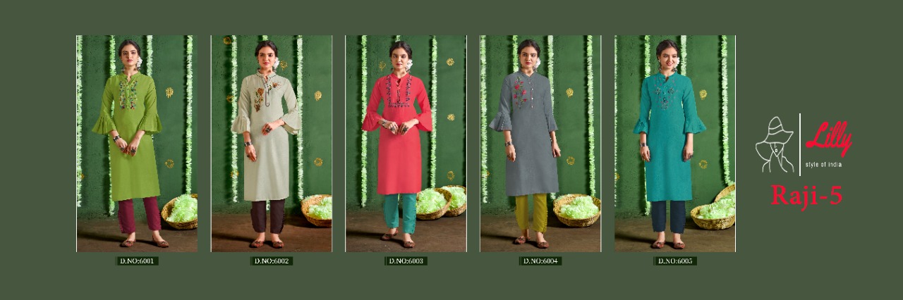 Buy Online Raji Vol 5 By Lilly Style Of India Kurti With Pant Dealer From All Over India 5 Pcs of Full Catalogue at Wholesale Price. Looking for Raji Vol 5 By Lilly Style Of India Kurti With Pant Dealer From All Over India Full Catalouge at Best Price? Buy Now Raji Vol 5 By Lilly Style Of India Kurti With Pant Dealer From All Over India at Wholesale Rate of Rs 2755 with Total 5 Pcs from authroized dealer and supplier of Brand. Cost of Each piece is just only Rs 551 which is very low and affordable price to resale the product in your retail store ,This is Surat based Wholesale Supplier & Dealer of Brand. Click on Brand name to Know more about Brand's products.Call or Whatsapp on 9898838984 for booking or enquiry