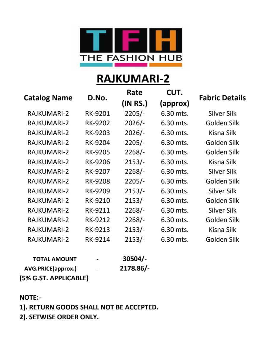 *LOOSE PCS AVAILABLE* Set @ loose @ Singel *TFH .* CATALOG NAME Â? RAJKUMARI 2nd EDITION. SERIES - *9201 TO 9214.* *FABRICS DETAILS &* *RATE LIST ATTACHED* GST 5% EXTRA *SET & LOOSE & SINGLE* DELIVERY- RUNNING BOOK YOUR ORDER NOW 100+single by |