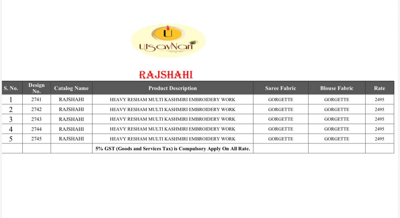 Buy Online RAJSHAHI by utsav nari fashion saree collection manufacturer Surat 5 Pcs of Full Catalogue at Wholesale Price. Looking for RAJSHAHI by utsav nari fashion saree collection manufacturer Surat Full Catalouge at Best Price? Buy Now RAJSHAHI by utsav nari fashion saree collection manufacturer Surat at Wholesale Rate of Rs 12475 with Total 5 Pcs from authroized dealer and supplier of UTSAV NARI Brand. Cost of Each piece is just only Rs 2495 which is very low and affordable price to resale the product in your retail store ,This is Surat based Wholesale Supplier & Dealer of UTSAV NARI Brand. Click on Brand name to Know more about UTSAV NARI Brand's products.Call or Whatsapp on 9898838984 for booking or enquiry