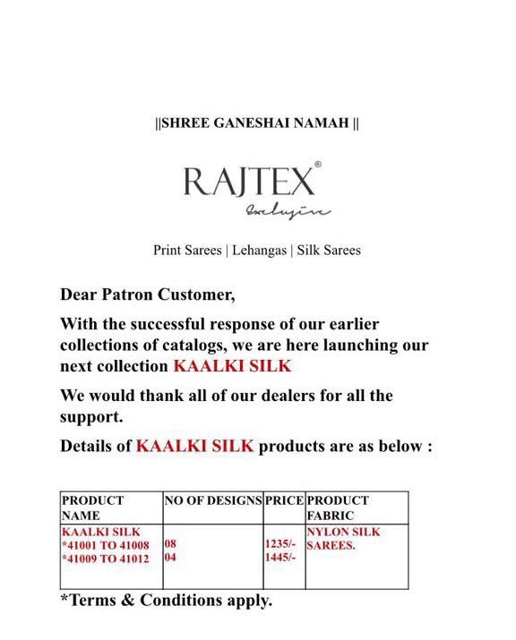 Raj tex 41001 To 41012. KAALKI SILK GST 5 Percent Extra. Delivery- Running. FOR SINGLE'S PRICE CALL OR WHATSAPP ON +919898838984 |