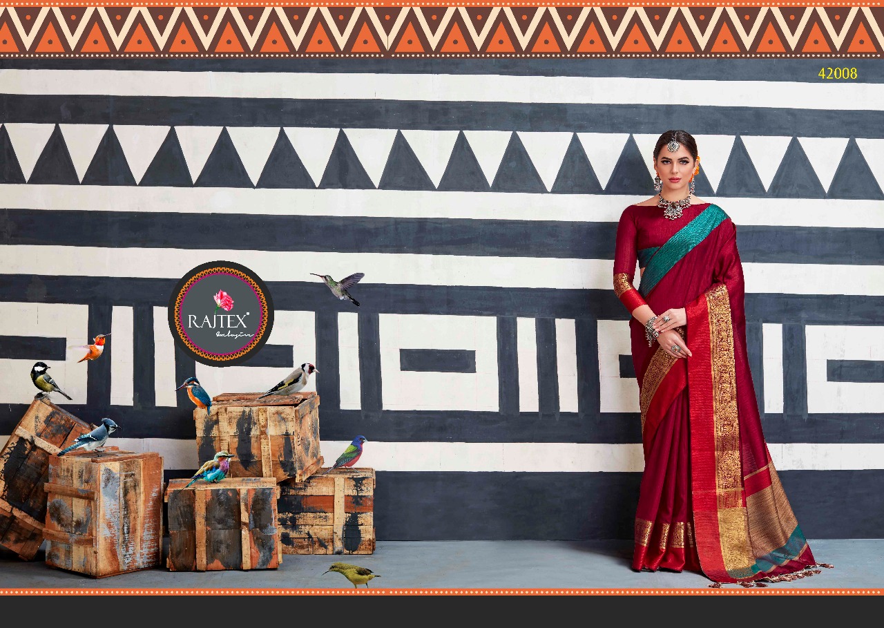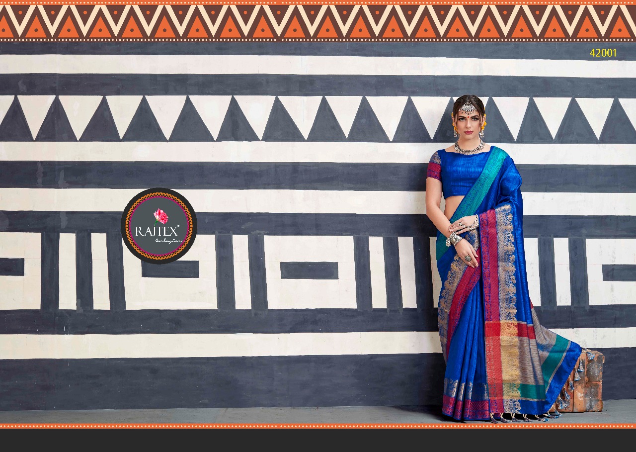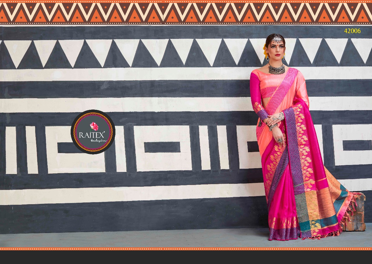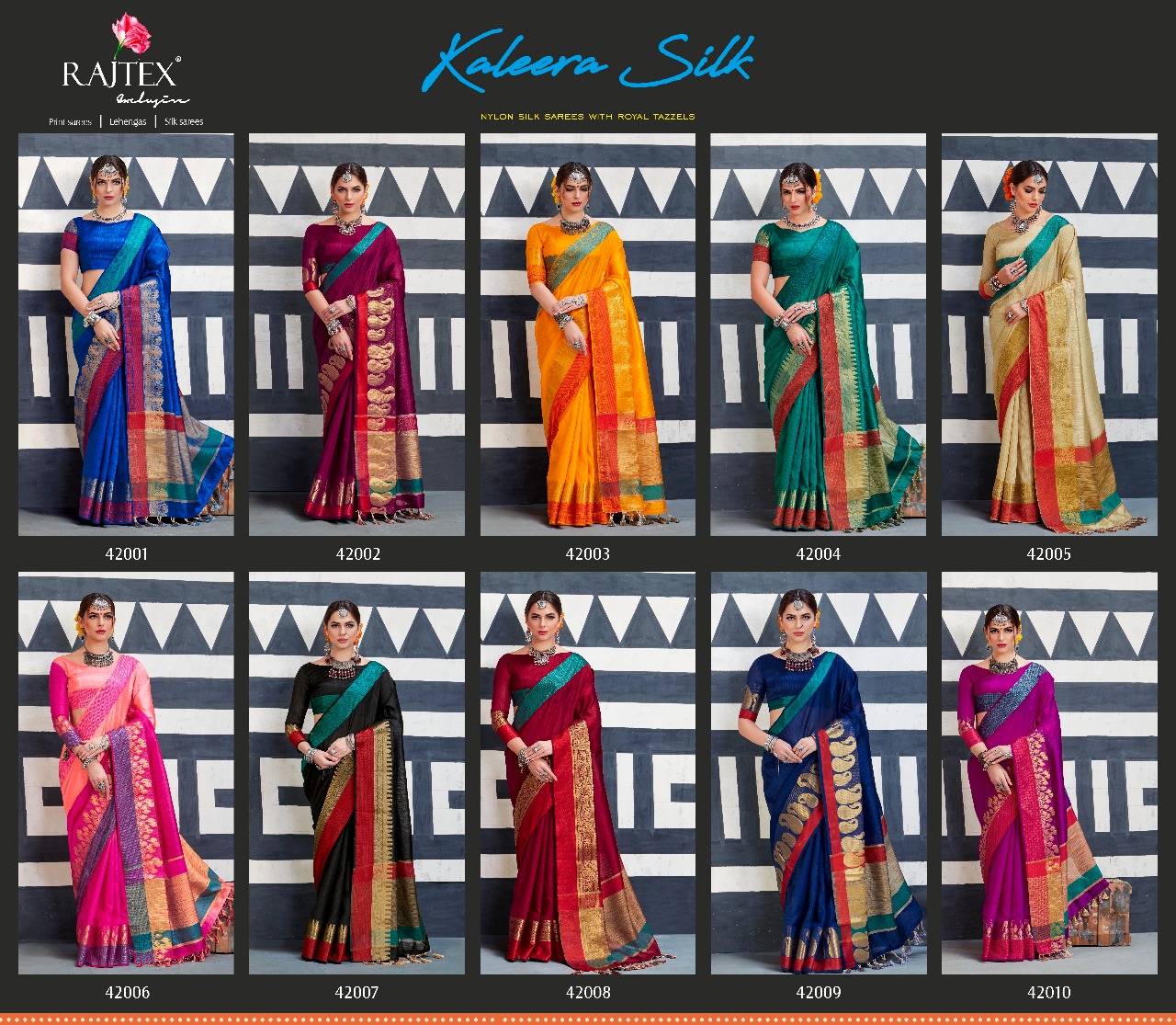 Buy Online Rajtex Kaleera Silk 42001 Series Naylon Silk Saree 10 Pcs of Full Catalogue at Wholesale Price. Looking for Rajtex Kaleera Silk 42001 Series Naylon Silk Saree Full Catalouge at Best Price? Buy Now Rajtex Kaleera Silk 42001 Series Naylon Silk Saree at Wholesale Rate of Rs 11500 with Total 10 Pcs from authroized dealer and supplier of RAJTEX Brand. Cost of Each piece is just only Rs 1150 which is very low and affordable price to resale the product in your retail store ,This is Surat based Wholesale Supplier & Dealer of RAJTEX Brand. Click on Brand name to Know more about RAJTEX Brand's products.Call or Whatsapp on 9898838984 for booking or enquiry