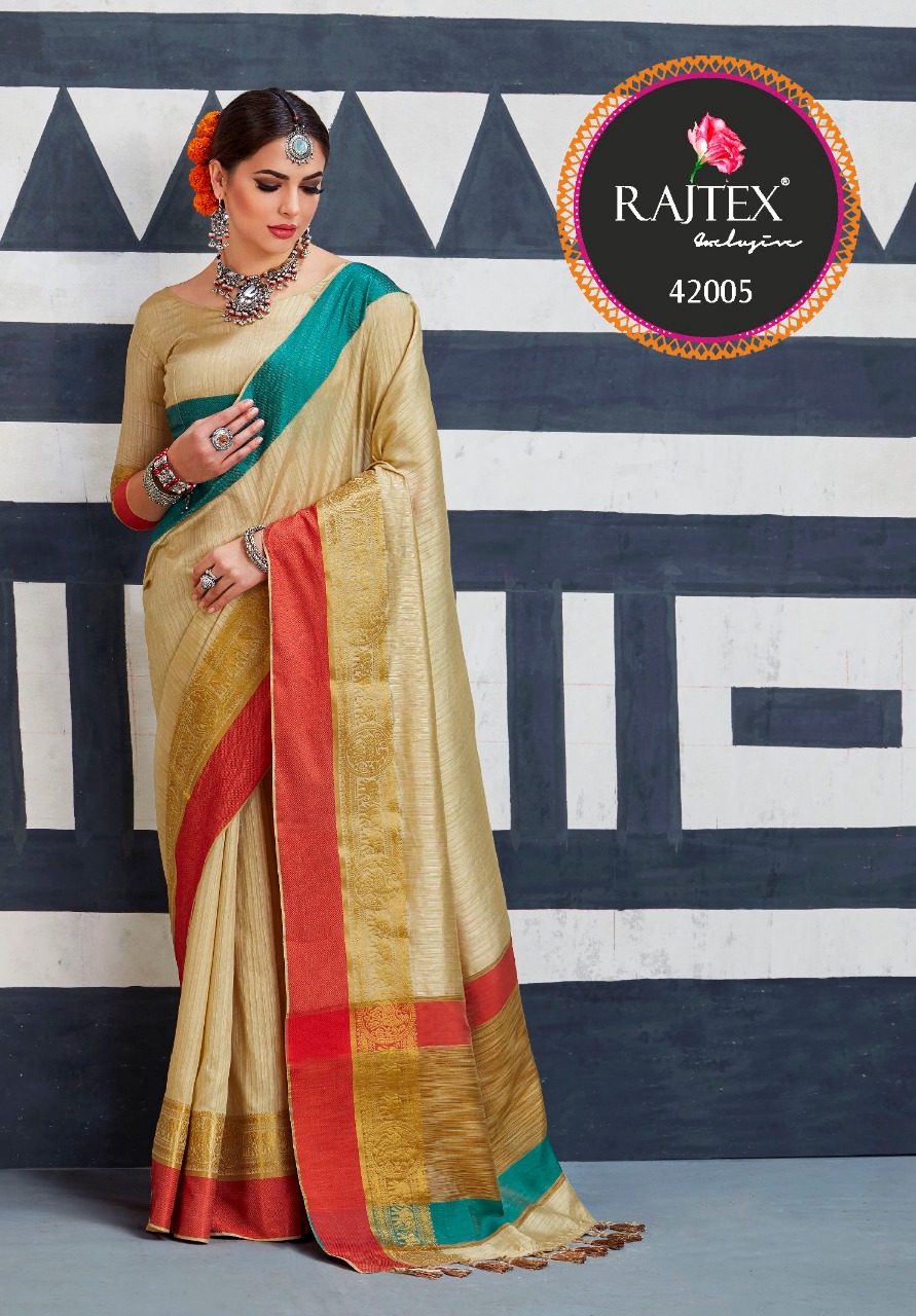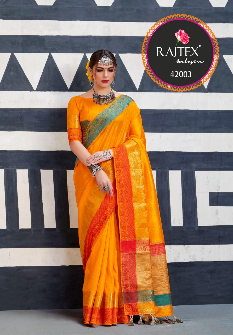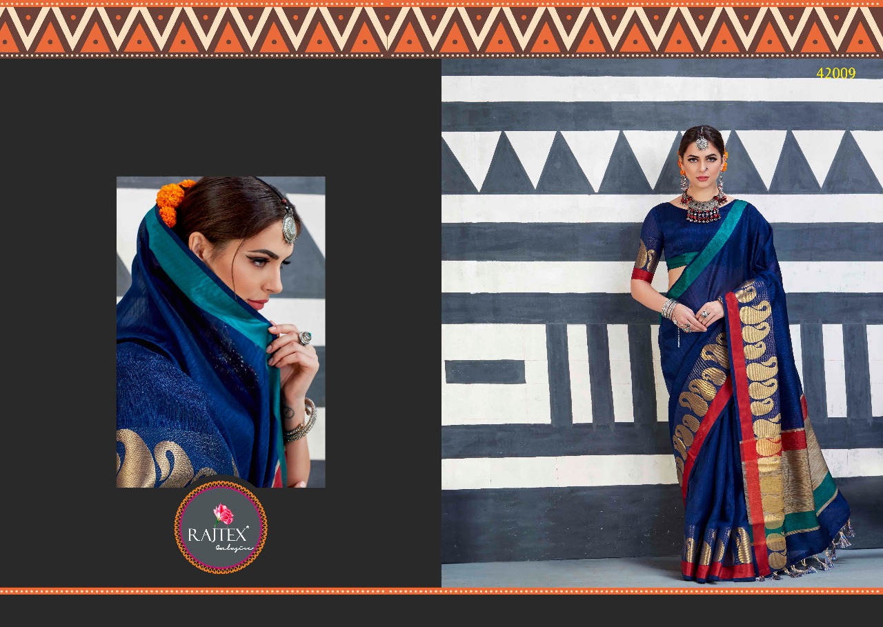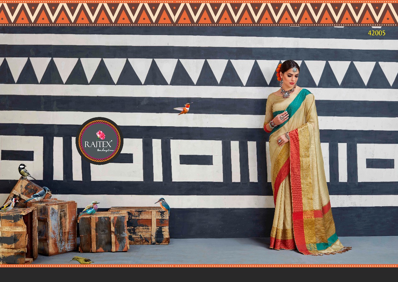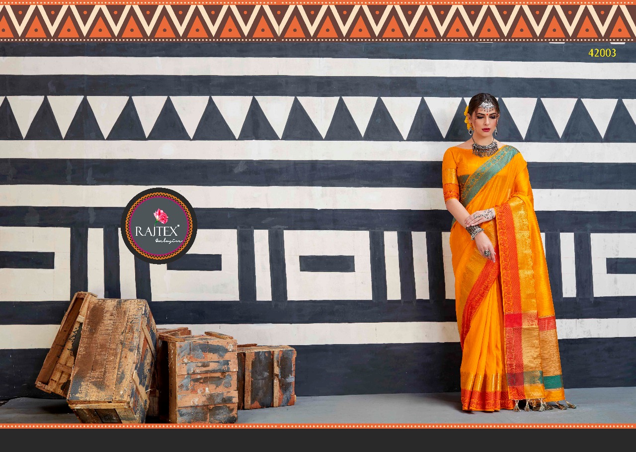 Buy Online Rajtex Kaleera Silk 42001 Series Naylon Silk Saree 10 Pcs of Full Catalogue at Wholesale Price. Looking for Rajtex Kaleera Silk 42001 Series Naylon Silk Saree Full Catalouge at Best Price? Buy Now Rajtex Kaleera Silk 42001 Series Naylon Silk Saree at Wholesale Rate of Rs 11500 with Total 10 Pcs from authroized dealer and supplier of RAJTEX Brand. Cost of Each piece is just only Rs 1150 which is very low and affordable price to resale the product in your retail store ,This is Surat based Wholesale Supplier & Dealer of RAJTEX Brand. Click on Brand name to Know more about RAJTEX Brand's products.Call or Whatsapp on 9898838984 for booking or enquiry