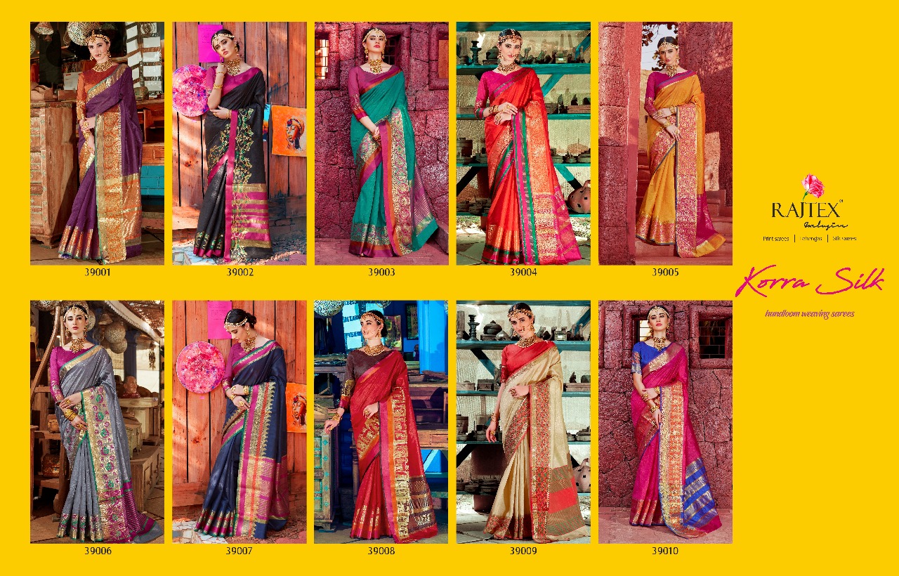 Buy Online Rajtex Korra Silk 39001 Series Handloom Weaving Silk Sarees 10 Pcs of Full Catalogue at Wholesale Price. Looking for Rajtex Korra Silk 39001 Series Handloom Weaving Silk Sarees Full Catalouge at Best Price? Buy Now Rajtex Korra Silk 39001 Series Handloom Weaving Silk Sarees at Wholesale Rate of Rs 7350 with Total 10 Pcs from authroized dealer and supplier of RAJTEX Brand. Cost of Each piece is just only Rs 735 which is very low and affordable price to resale the product in your retail store ,This is Surat based Wholesale Supplier & Dealer of RAJTEX Brand. Click on Brand name to Know more about RAJTEX Brand's products.Call or Whatsapp on 9898838984 for booking or enquiry