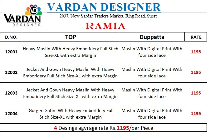 Buy Online Ramia By Vardan Designer Musline Designer Gowns With Duppta Wholesale Supplier And Dealer Gujarat 4 Pcs of Full Catalogue at Wholesale Price. Looking for Ramia By Vardan Designer Musline Designer Gowns With Duppta Wholesale Supplier And Dealer Gujarat Full Catalouge at Best Price? Buy Now Ramia By Vardan Designer Musline Designer Gowns With Duppta Wholesale Supplier And Dealer Gujarat at Wholesale Rate of Rs 4780 with Total 4 Pcs from authroized dealer and supplier of VARDAN DESIGNER Brand. Cost of Each piece is just only Rs 1195 which is very low and affordable price to resale the product in your retail store ,This is Surat based Wholesale Supplier & Dealer of VARDAN DESIGNER Brand. Click on Brand name to Know more about VARDAN DESIGNER Brand's products.Call or Whatsapp on 9898838984 for booking or enquiry