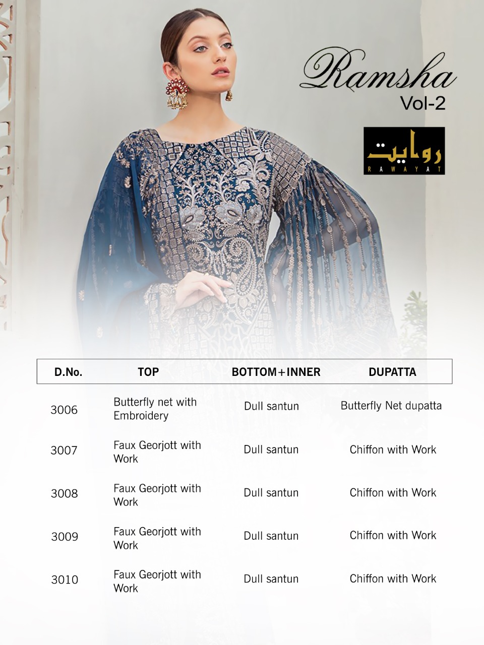 Buy Online Ramsha Vol 2 Chiffon 2020 By Rawayat Pakistani Suits Wholesale Supplier And Dealer Gujarat 5 Pcs of Full Catalogue at Wholesale Price. Looking for Ramsha Vol 2 Chiffon 2020 By Rawayat Pakistani Suits Wholesale Supplier And Dealer Gujarat Full Catalouge at Best Price? Buy Now Ramsha Vol 2 Chiffon 2020 By Rawayat Pakistani Suits Wholesale Supplier And Dealer Gujarat at Wholesale Rate of Rs 6495 with Total 5 Pcs from authroized dealer and supplier of Brand. Cost of Each piece is just only Rs 1299 which is very low and affordable price to resale the product in your retail store ,This is Surat based Wholesale Supplier & Dealer of Brand. Click on Brand name to Know more about Brand's products.Call or Whatsapp on 9898838984 for booking or enquiry