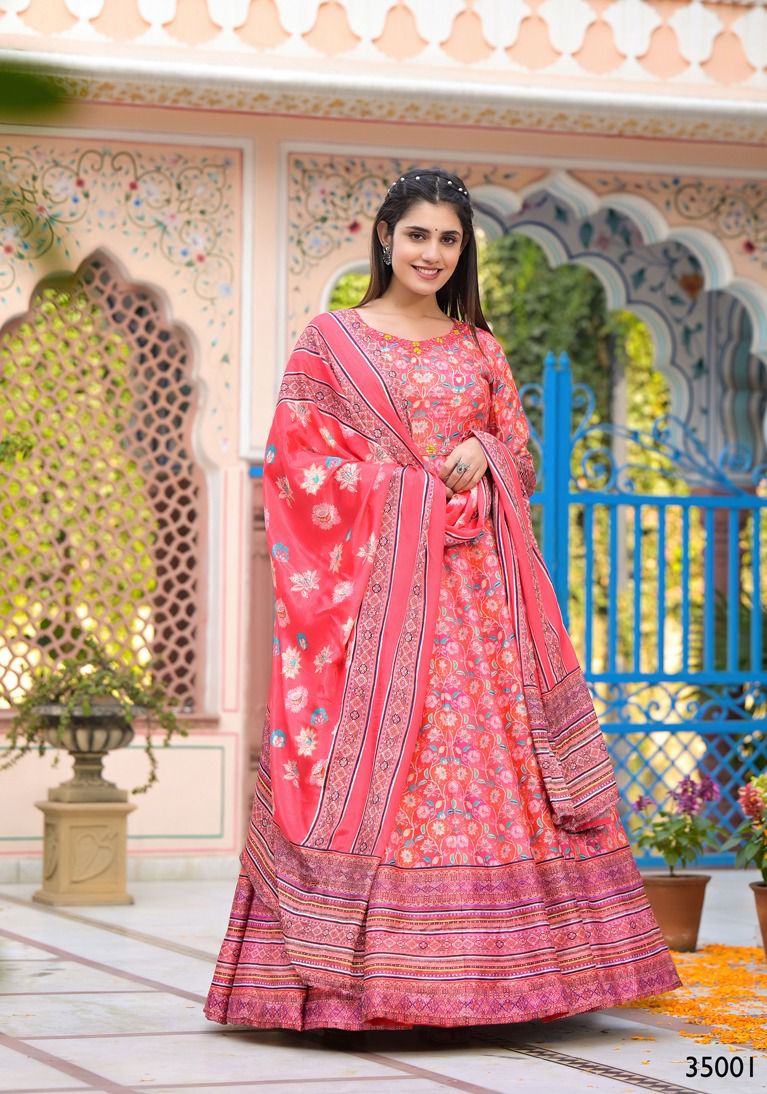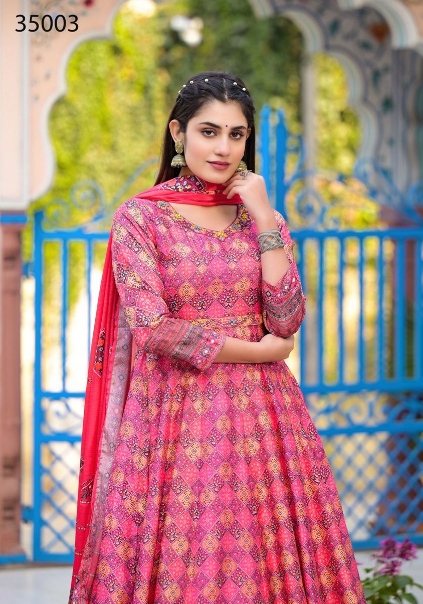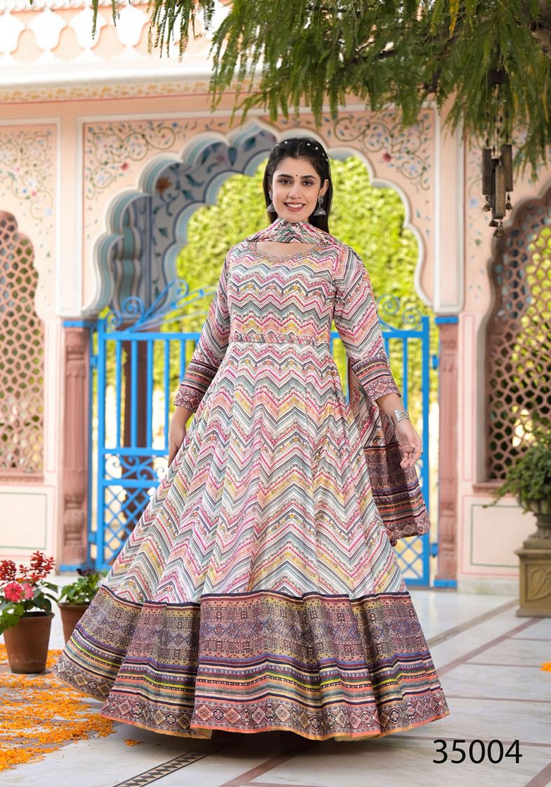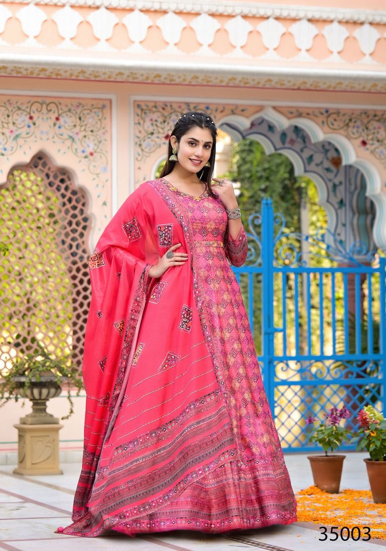 Brand - Tejasvee Digital Print and Handwork Concept Gown with Dupatta. Catalog Name:- Ramya. Fabric Details:- Gown fabric:- Dola silk. Dupatta fabric:- Soft Chinon. Work:- Digital Print & Handwork on Waist Belt and Neckline Length:- Up to 59. WeightL:- 2 kg. Size (Full stitched):-L(40),XL(42),XXL(44). Total 4 Designs. GST:- 12%. Per extra SINGLE AVAILABLE 100+ SINGLE |