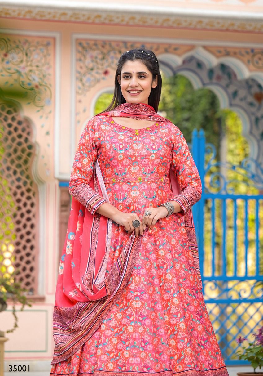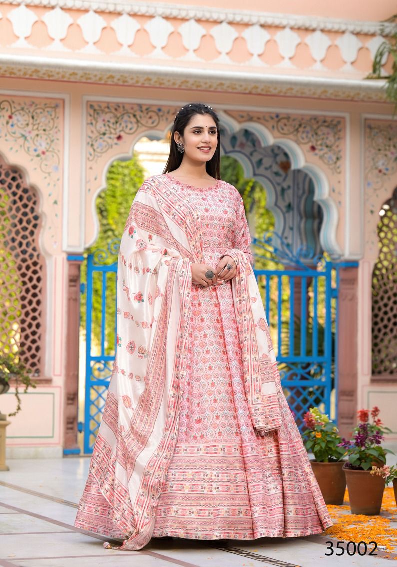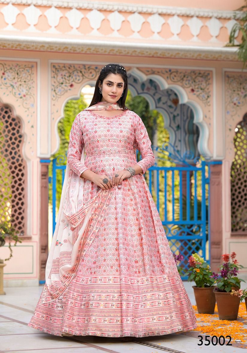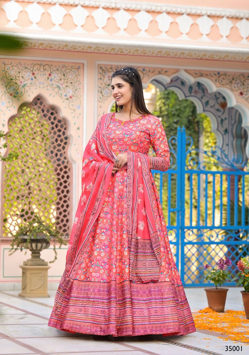 Brand - Tejasvee Digital Print and Handwork Concept Gown with Dupatta. Catalog Name:- Ramya. Fabric Details:- Gown fabric:- Dola silk. Dupatta fabric:- Soft Chinon. Work:- Digital Print & Handwork on Waist Belt and Neckline Length:- Up to 59. WeightL:- 2 kg. Size (Full stitched):-L(40),XL(42),XXL(44). Total 4 Designs. GST:- 12%. Per extra SINGLE AVAILABLE 100+ SINGLE |