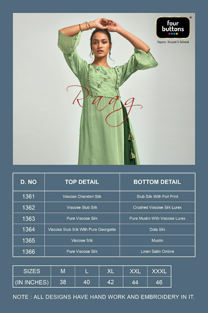 *Brand :* FOUR BUTTONS *Catalog Name :* Raag *Price :* ?1295 *Piece :* 6 *Total Price :* 7770 ( GST Extra ) *Size :* M,L,XL,XXL,XXXL *Fabric :* Viscose *Availibility :* On Booking Only set to set |