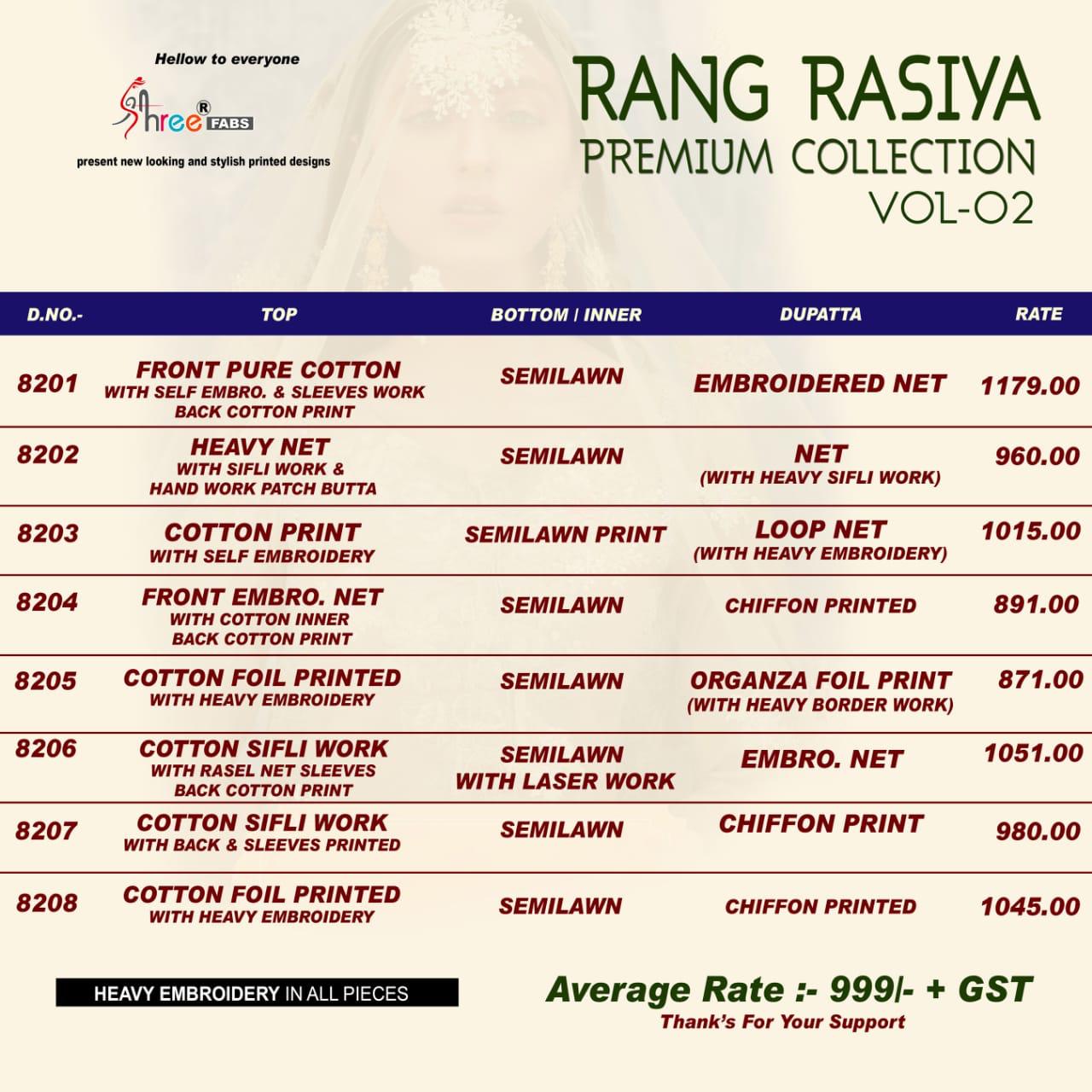 Buy Online Rang Rasiya Premium Collection Vol 2 By Shree Fabs 8201 Series Designer Fancy Cotton Pakistani Style Salwar Kameez Catlog Wholesaler Surat 8 Pcs of Full Catalogue at Wholesale Price. Looking for Rang Rasiya Premium Collection Vol 2 By Shree Fabs 8201 Series Designer Fancy Cotton Pakistani Style Salwar Kameez Catlog Wholesaler Surat Full Catalouge at Best Price? Buy Now Rang Rasiya Premium Collection Vol 2 By Shree Fabs 8201 Series Designer Fancy Cotton Pakistani Style Salwar Kameez Catlog Wholesaler Surat at Wholesale Rate of Rs 7992 with Total 8 Pcs from authroized dealer and supplier of SHREE FABS Brand. Cost of Each piece is just only Rs 999 which is very low and affordable price to resale the product in your retail store ,This is Surat based Wholesale Supplier & Dealer of SHREE FABS Brand. Click on Brand name to Know more about SHREE FABS Brand's products.Call or Whatsapp on 9898838984 for booking or enquiry