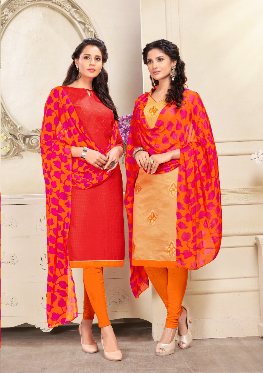 Catlog----- Rang-Tarang(two top) By Navkar -----Fabrics---- ? Top - Cotton buti+ chanderi cotton ?Bottam- cottan. Duptta - Print Rate -575 per pcs . Set to set . GST 5 Percent Extra. Delivery 2 days . Des------------1?2?pcs only Confirm ur order as soon as possible |