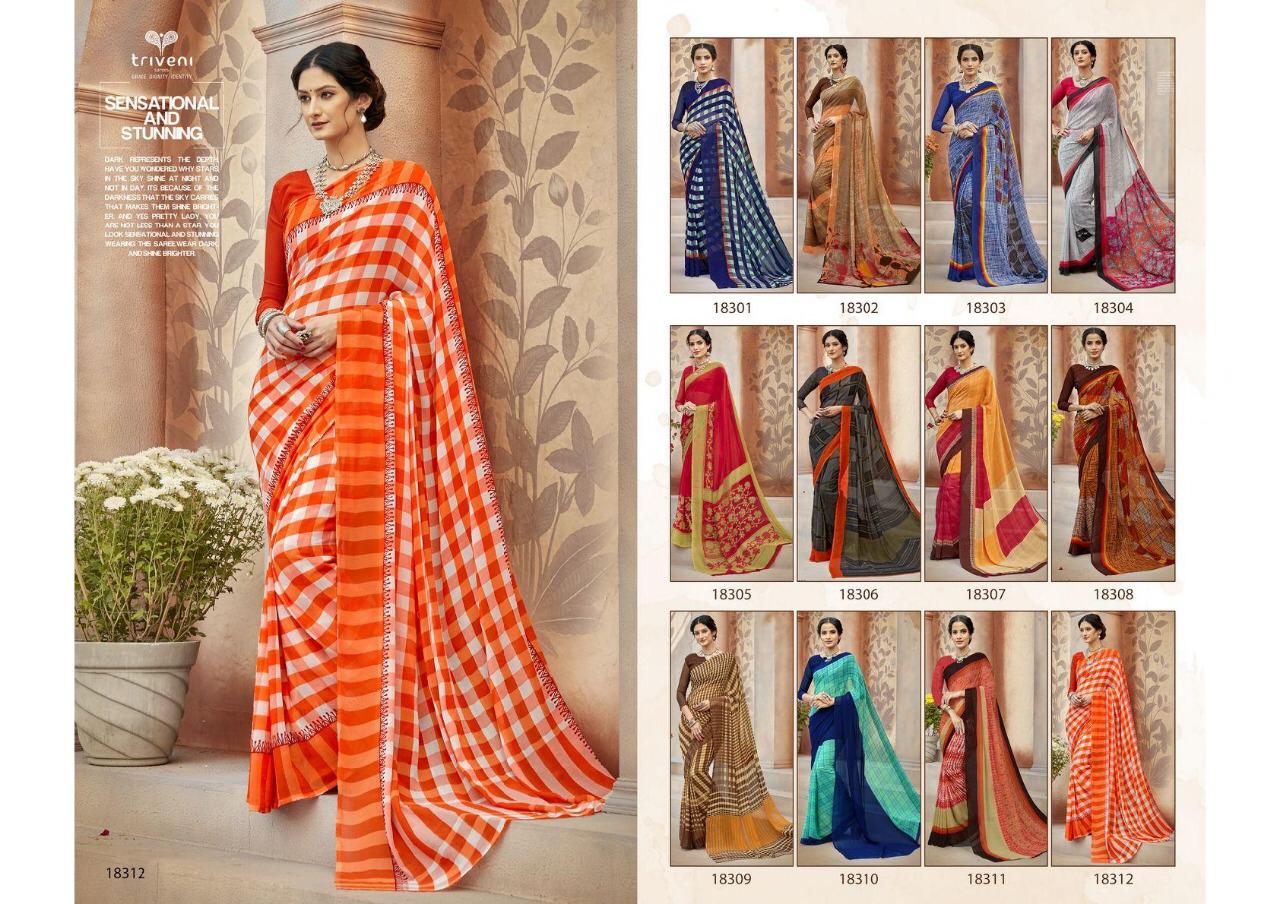 Buy Online Rangat By Triveni 18301 Fancy Casual Wear Printed Saree Collection Wholesale Dealer Surat 12 Pcs of Full Catalogue at Wholesale Price. Looking for Rangat By Triveni 18301 Fancy Casual Wear Printed Saree Collection Wholesale Dealer Surat Full Catalouge at Best Price? Buy Now Rangat By Triveni 18301 Fancy Casual Wear Printed Saree Collection Wholesale Dealer Surat at Wholesale Rate of Rs 5016 with Total 12 Pcs from authroized dealer and supplier of TRIVENI Brand. Cost of Each piece is just only Rs 418 which is very low and affordable price to resale the product in your retail store ,This is Surat based Wholesale Supplier & Dealer of TRIVENI Brand. Click on Brand name to Know more about TRIVENI Brand's products.Call or Whatsapp on 9898838984 for booking or enquiry