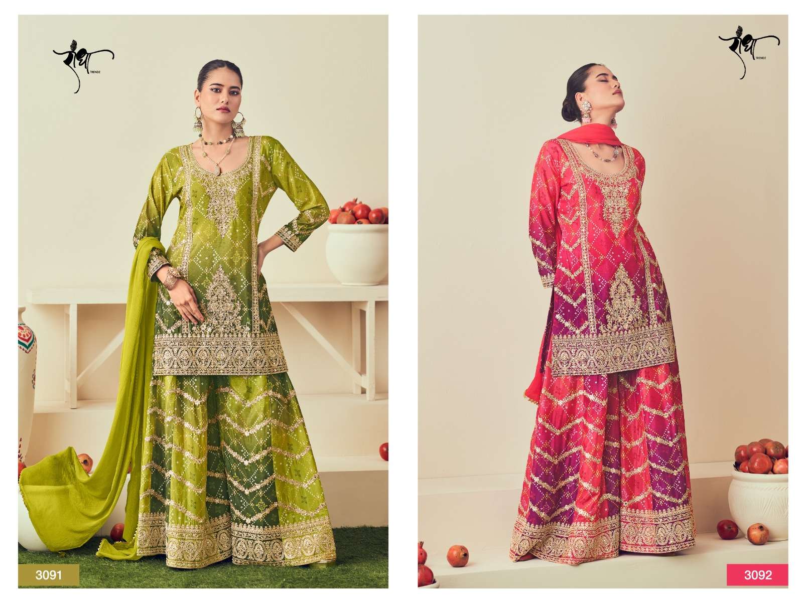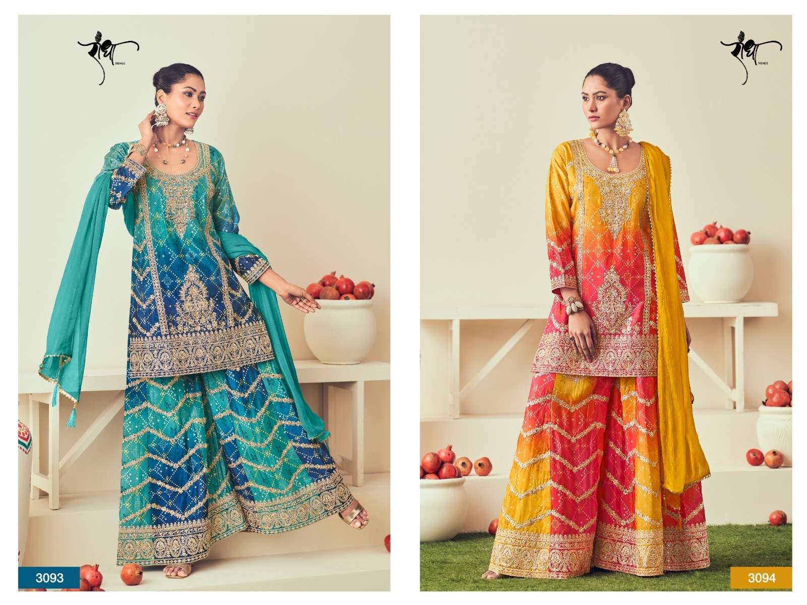BRAND: RADHA TRENDZ CATALOG - RANGMAHAL🌺 SERIES – 3091 TO 3094 TOP: HEAVY PREMIUM CHINON WITH HEAVY EMBROIDARY WORK & MIRROR & JARKAN WORK BOTTOM : HEAVY PREMIUM CHINON WITH DIGITAL PRINT &EMBROIDARY WORK & JARKAN WORK. ( fRONt & BAcK WORK ) STYLE : PLAZO WORK DUPATTA: HEAVY CHIFFON WITH FANCY LATKAN RATE:2795/- per pcs GST EXTRA