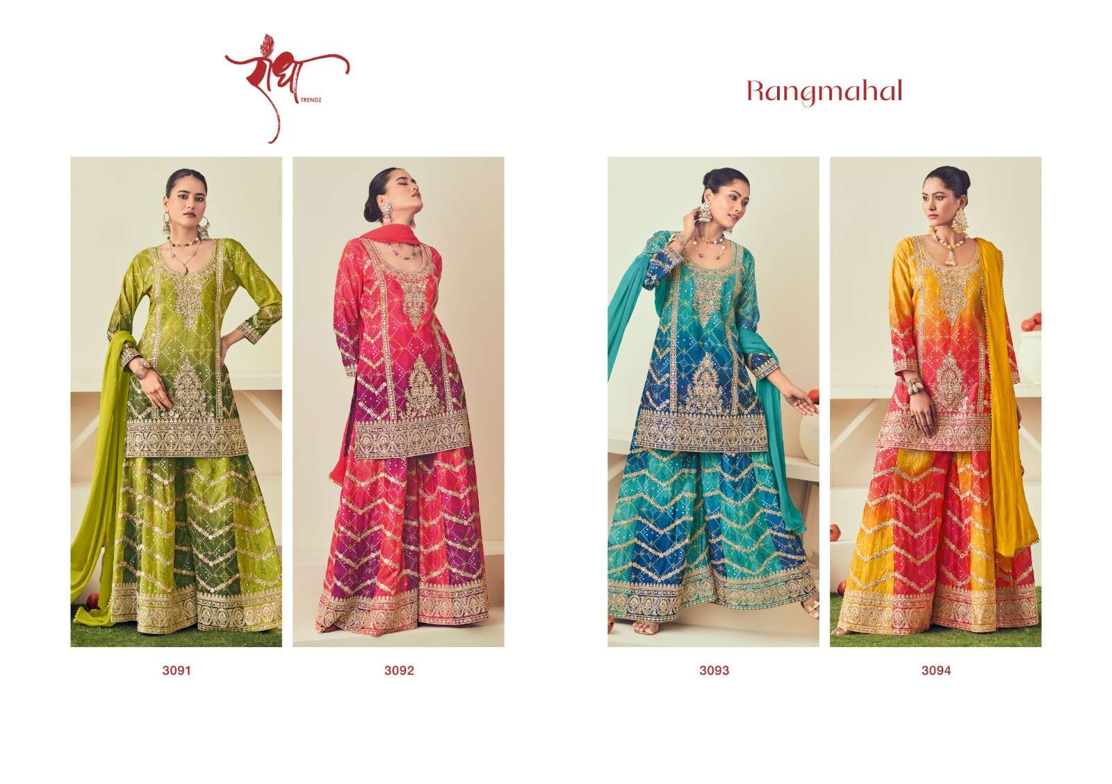 Buy Online RANGMAHAL SERIES 3091 TO 3094 By RADHA TRENDZ suit collection manufacturers surat 4 Pcs of Full Catalogue at Wholesale Price. Looking for RANGMAHAL SERIES 3091 TO 3094 By RADHA TRENDZ suit collection manufacturers surat Full Catalouge at Best Price? Buy Now RANGMAHAL SERIES 3091 TO 3094 By RADHA TRENDZ suit collection manufacturers surat at Wholesale Rate of Rs 11180 with Total 4 Pcs from authroized dealer and supplier of Radha Trendz Brand. Cost of Each piece is just only Rs 2795 which is very low and affordable price to resale the product in your retail store ,This is Surat based Wholesale Supplier & Dealer of Radha Trendz Brand. Click on Brand name to Know more about Radha Trendz Brand's products.Call or Whatsapp on 9898838984 for booking or enquiry