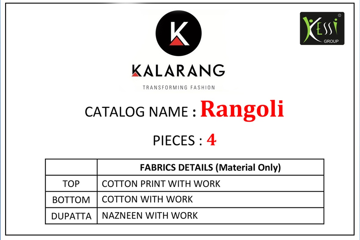 ? *Kalarang* has launched _Catalog name_ : *Rangoli* ? _Fabric Details_ ? ?Top :- COTTON PRINT WITH WORK ?Bottom:- COTTON WITH WORK ?Dupatta:- NAZNEEN WITH WORK ?Total Design :- 4 ?Dispatching 5 to 6 days later ?Booking started from now... ?Order yours soon.. Rate -599 per pcs . Set to set . GST 5 Percent Extra |