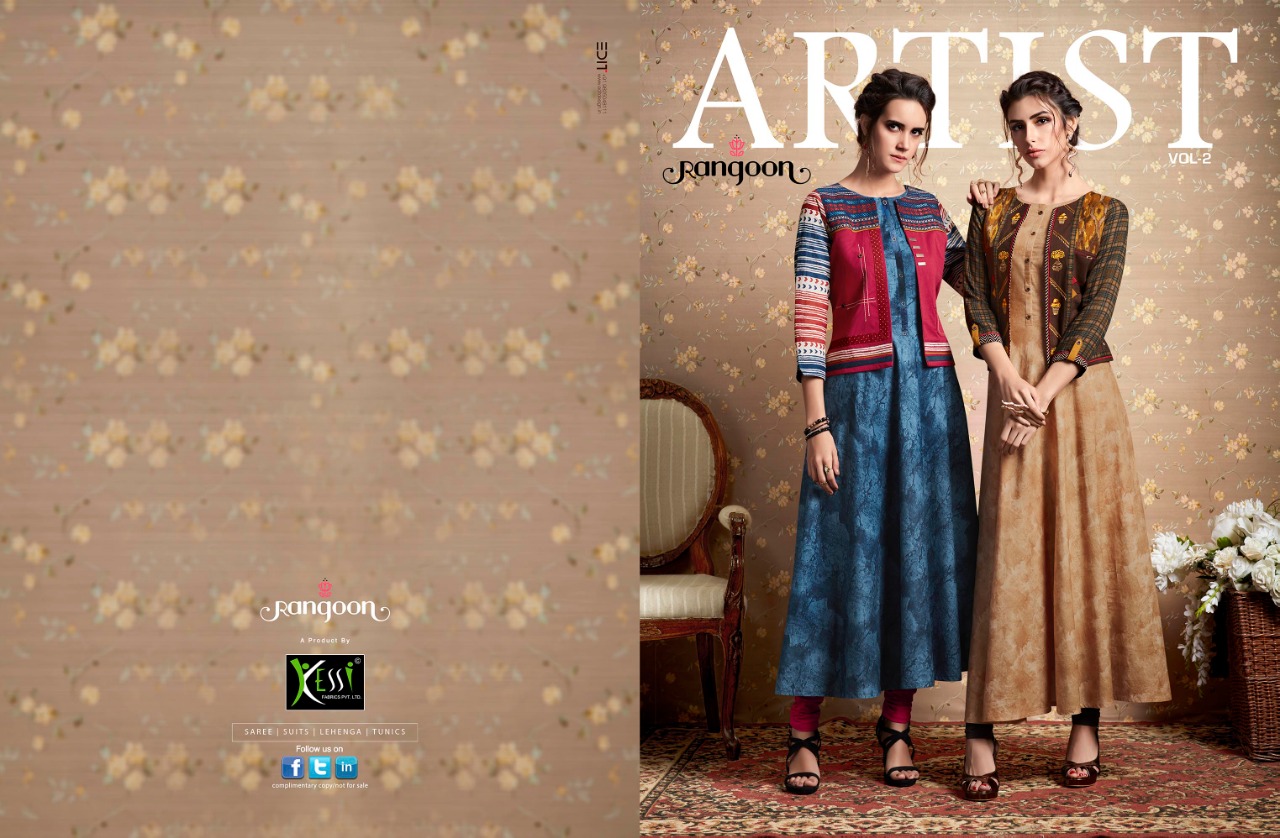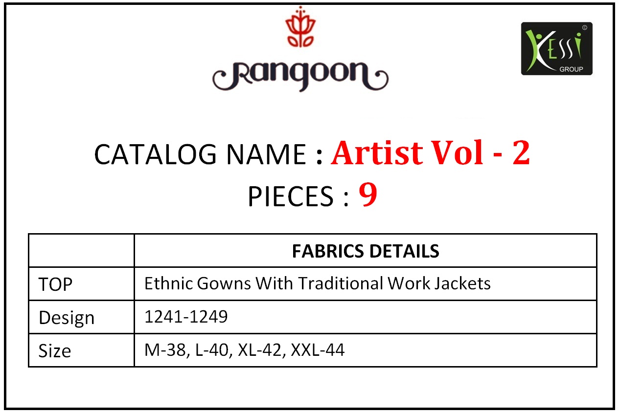 ? *Rangoon* *(Kessi Fabrics Pvt. Ltd.)* has launched _Catalog name_ : *Artist Vol - 2* ? _Fabric Details_ ? ?Top :- Ethnic Gowns With Traditional Work Jackets ?Total Design :- 9 ?Size:- M-38, L-40, XL-42, XXL-44 Rate 899/- ?Dispatching 5 to 6 days later |