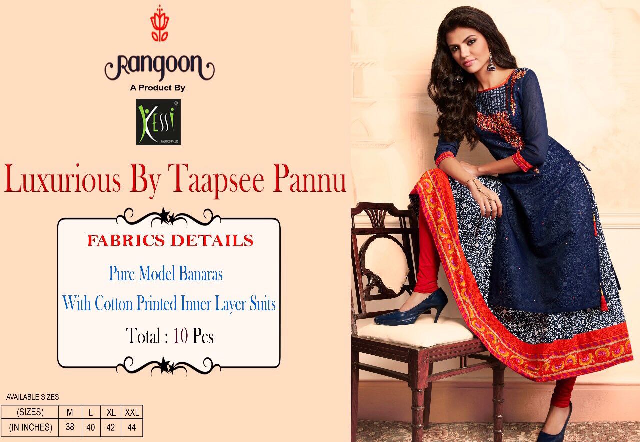 Rangoon has launch New catalog "Luxurious by Taapsee Pannu ".. Details :- Catalog Name :- Luxurious by Taapsee Pannu Designs :- 10 pcs Fabrics Detail Top :- Pure Modal Banaras With Cotton Printed Inner Layer Suits Size: M, L, XL and XXL Booking started from now... Book your order soon... Rate -999 per pcs . GST 5 Percent Extra. Set to set . Book your order |