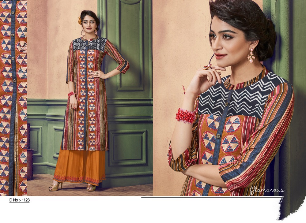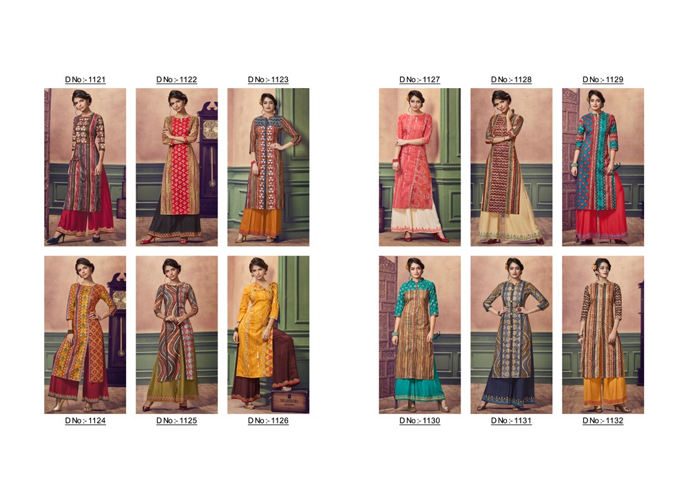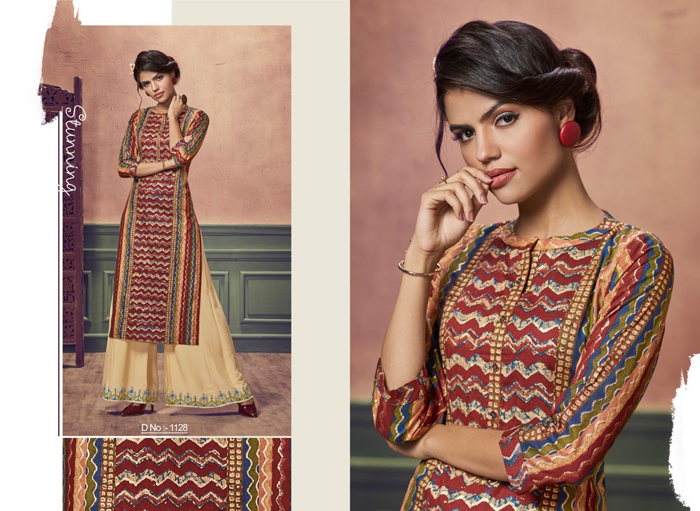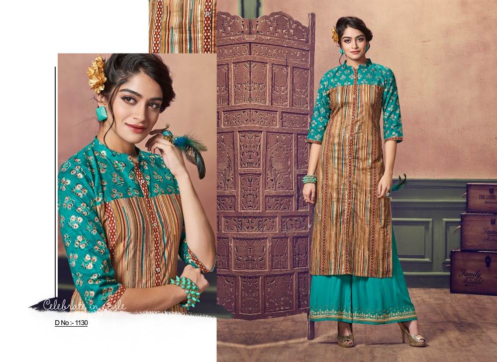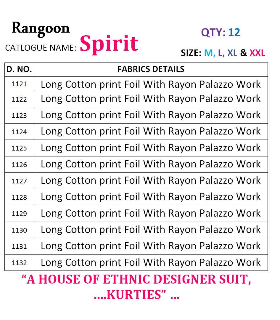 ??Rangoon has launch New catalog "Spirit "..?? ?Details :- ?Catalog Name :- Spirit ?Designs :- 12 pcs ??Fabrics Detail ?? ?Top :- ?Long Cotton print Foil With Rayon Palazzo Work ?Dispatching 5 to 6 days later? ?Booking started from now...??????????.? ?Book your order soon....??? Rate -799 per Pcs . Set to set . GST 5 Percent Extra. Delivery 3-4 days . Book your order |