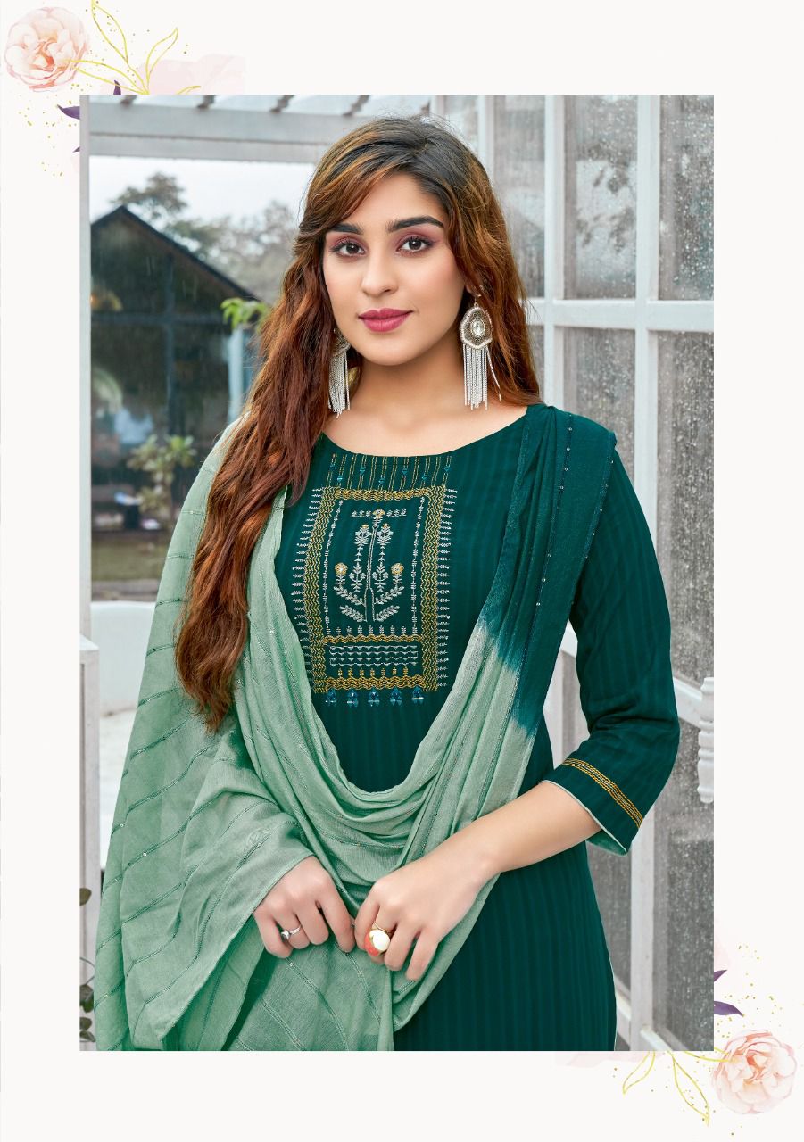 *Kurti* with *Bottom* & *Dupatta* Brand : *Mittoo* Catalog Name : *Rangpreet 2* Fabric : Top : *Rayon Weaving Stripes* Bottom : *Cotton Slub Lycra* with *Work* Dupatta : *Sequenc Viscose* Work : *Embroidery* & *Handwork* Size : *M(38), L(40), XL(42), XXL(44), 3XL(46)* Designs : *05* Price : *995/-* Per Piece + GST |