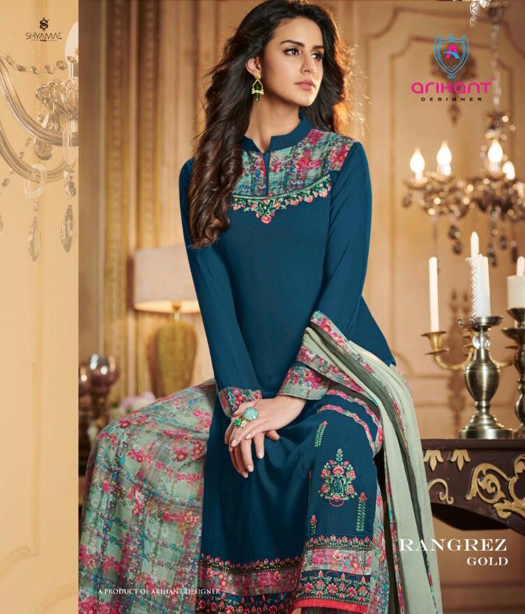 Buy Online Rangrez Gold By Arihant Designer Series 35002 A To 35002 E Georgette Printed Suits Wholesale Supplier Gujarat 5 Pcs of Full Catalogue at Wholesale Price. Looking for Rangrez Gold By Arihant Designer Series 35002 A To 35002 E Georgette Printed Suits Wholesale Supplier Gujarat Full Catalouge at Best Price? Buy Now Rangrez Gold By Arihant Designer Series 35002 A To 35002 E Georgette Printed Suits Wholesale Supplier Gujarat at Wholesale Rate of Rs 5975 with Total 5 Pcs from authroized dealer and supplier of ARIHANT Brand. Cost of Each piece is just only Rs 1195 which is very low and affordable price to resale the product in your retail store ,This is Surat based Wholesale Supplier & Dealer of ARIHANT Brand. Click on Brand name to Know more about ARIHANT Brand's products.Call or Whatsapp on 9898838984 for booking or enquiry
