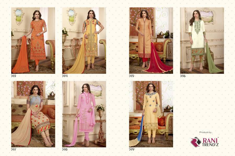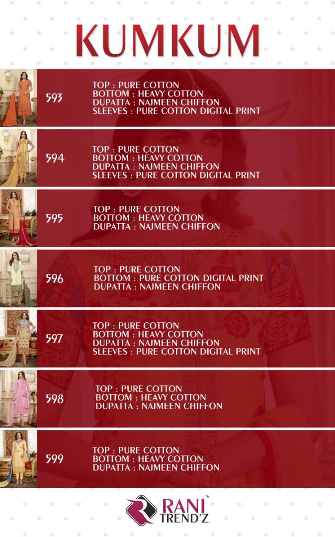 Buy Online Rani Kumkum 593 Series Designer Cotton Suit Catlog Surat 7 Pcs of Full Catalogue at Wholesale Price. Looking for Rani Kumkum 593 Series Designer Cotton Suit Catlog Surat Full Catalouge at Best Price? Buy Now Rani Kumkum 593 Series Designer Cotton Suit Catlog Surat at Wholesale Rate of Rs 4515 with Total 7 Pcs from authroized dealer and supplier of RANI TRENDZ Brand. Cost of Each piece is just only Rs 645 which is very low and affordable price to resale the product in your retail store ,This is Surat based Wholesale Supplier & Dealer of RANI TRENDZ Brand. Click on Brand name to Know more about RANI TRENDZ Brand's products.Call or Whatsapp on 9898838984 for booking or enquiry