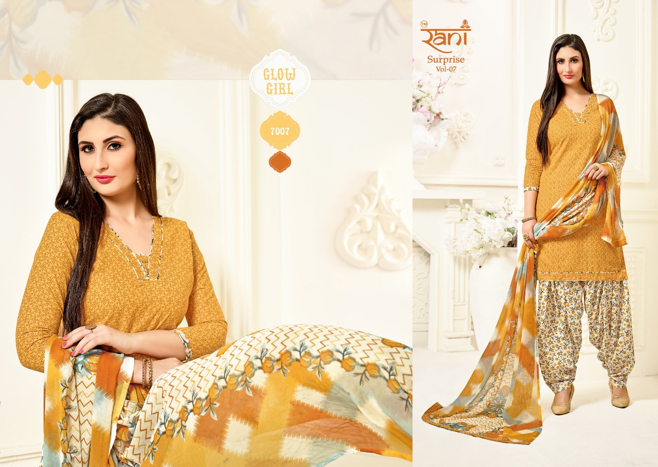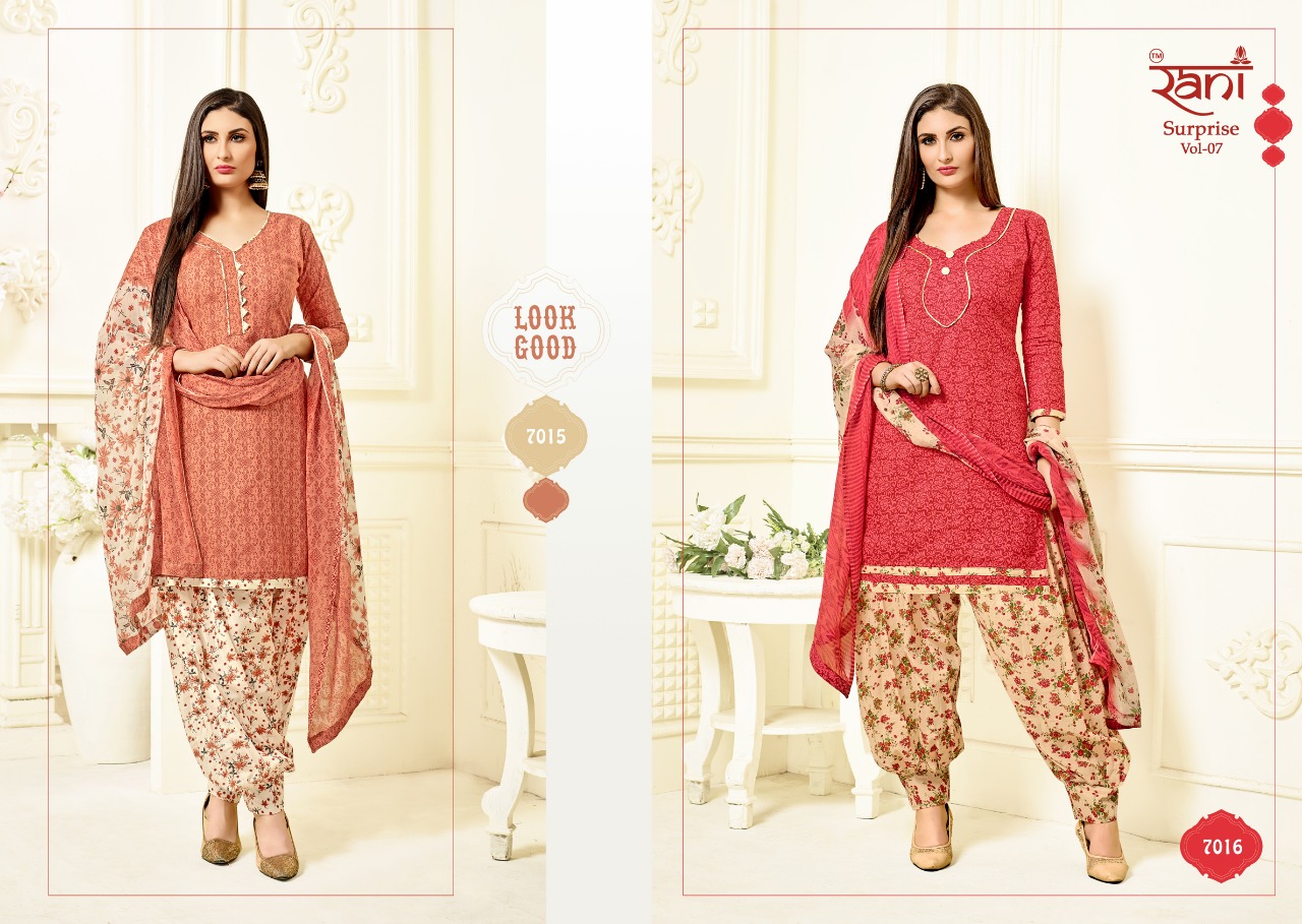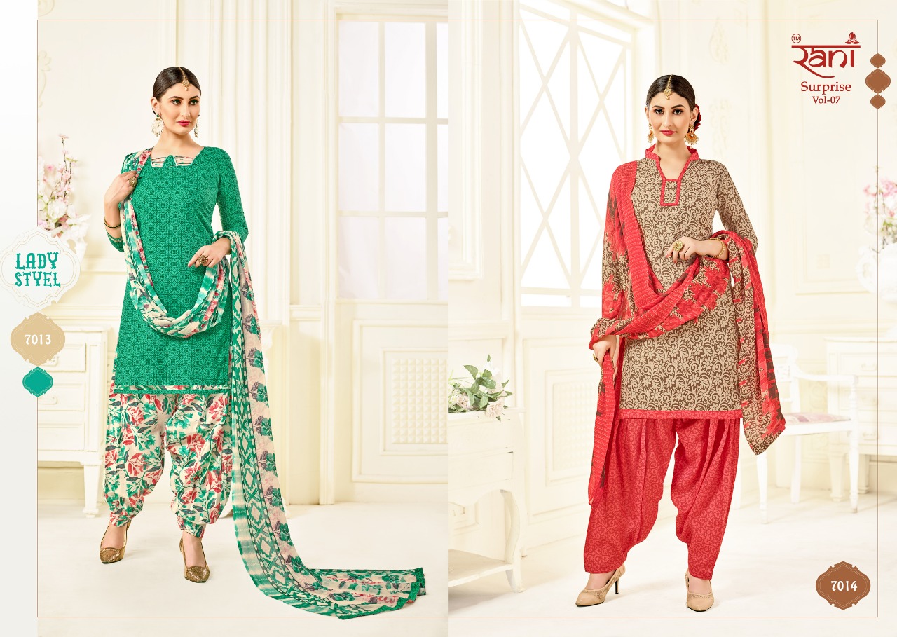 Buy Online Rani Surprise Vol 7 7001 Series Cotton Print Patiala Suit 16 Pcs of Full Catalogue at Wholesale Price. Looking for Rani Surprise Vol 7 7001 Series Cotton Print Patiala Suit Full Catalouge at Best Price? Buy Now Rani Surprise Vol 7 7001 Series Cotton Print Patiala Suit at Wholesale Rate of Rs 5200 with Total 16 Pcs from authroized dealer and supplier of RANI Brand. Cost of Each piece is just only Rs 325 which is very low and affordable price to resale the product in your retail store ,This is Surat based Wholesale Supplier & Dealer of RANI Brand. Click on Brand name to Know more about RANI Brand's products.Call or Whatsapp on 9898838984 for booking or enquiry