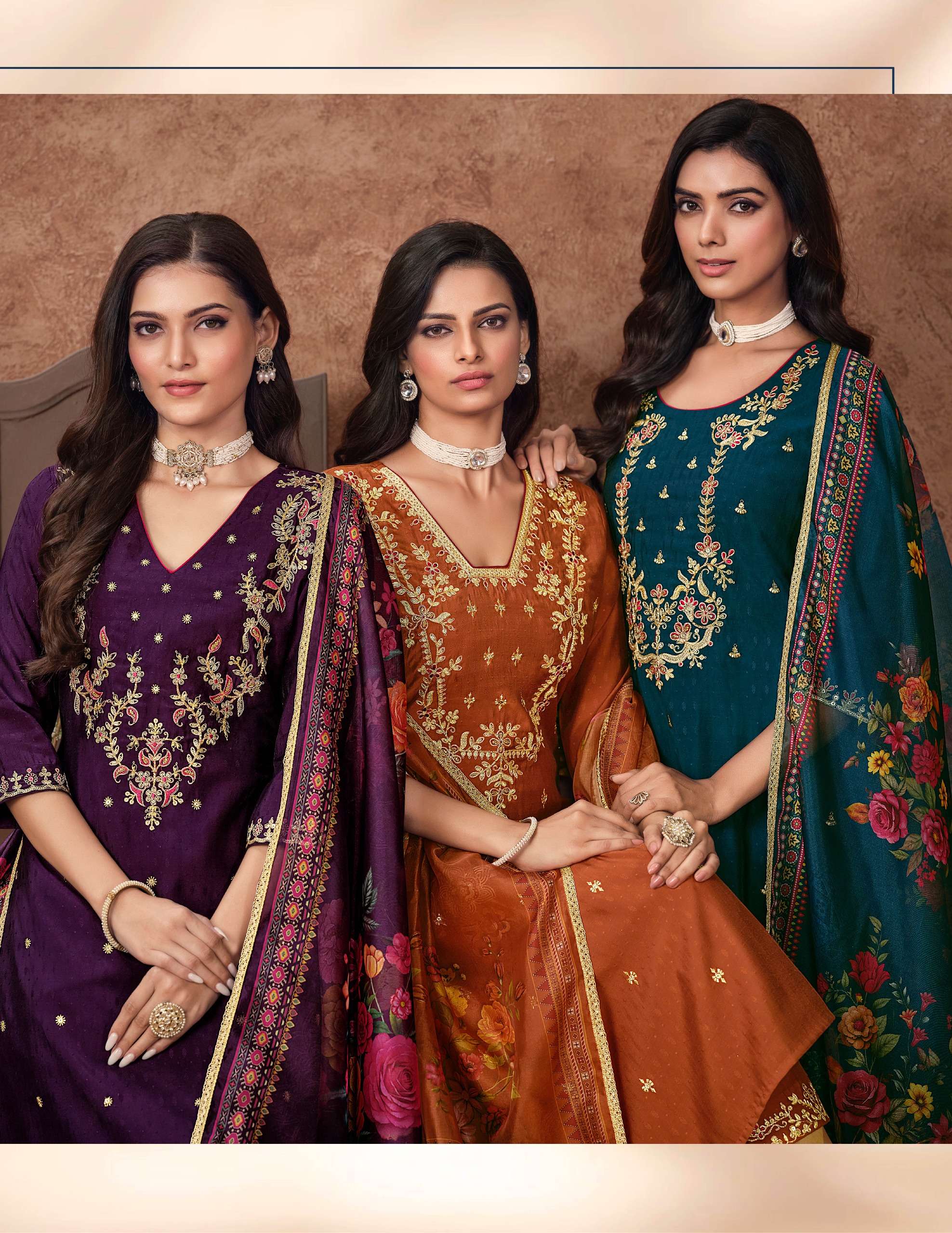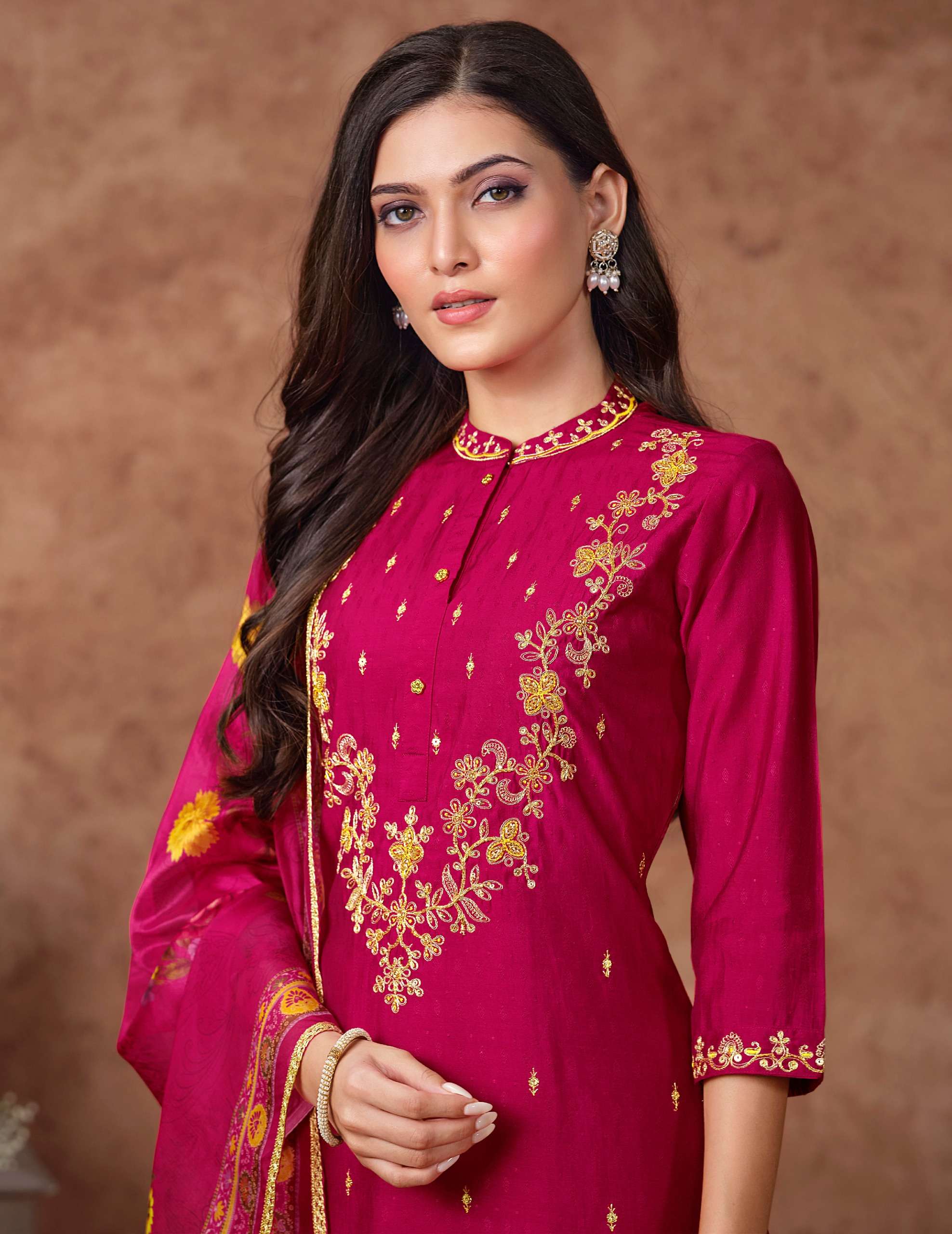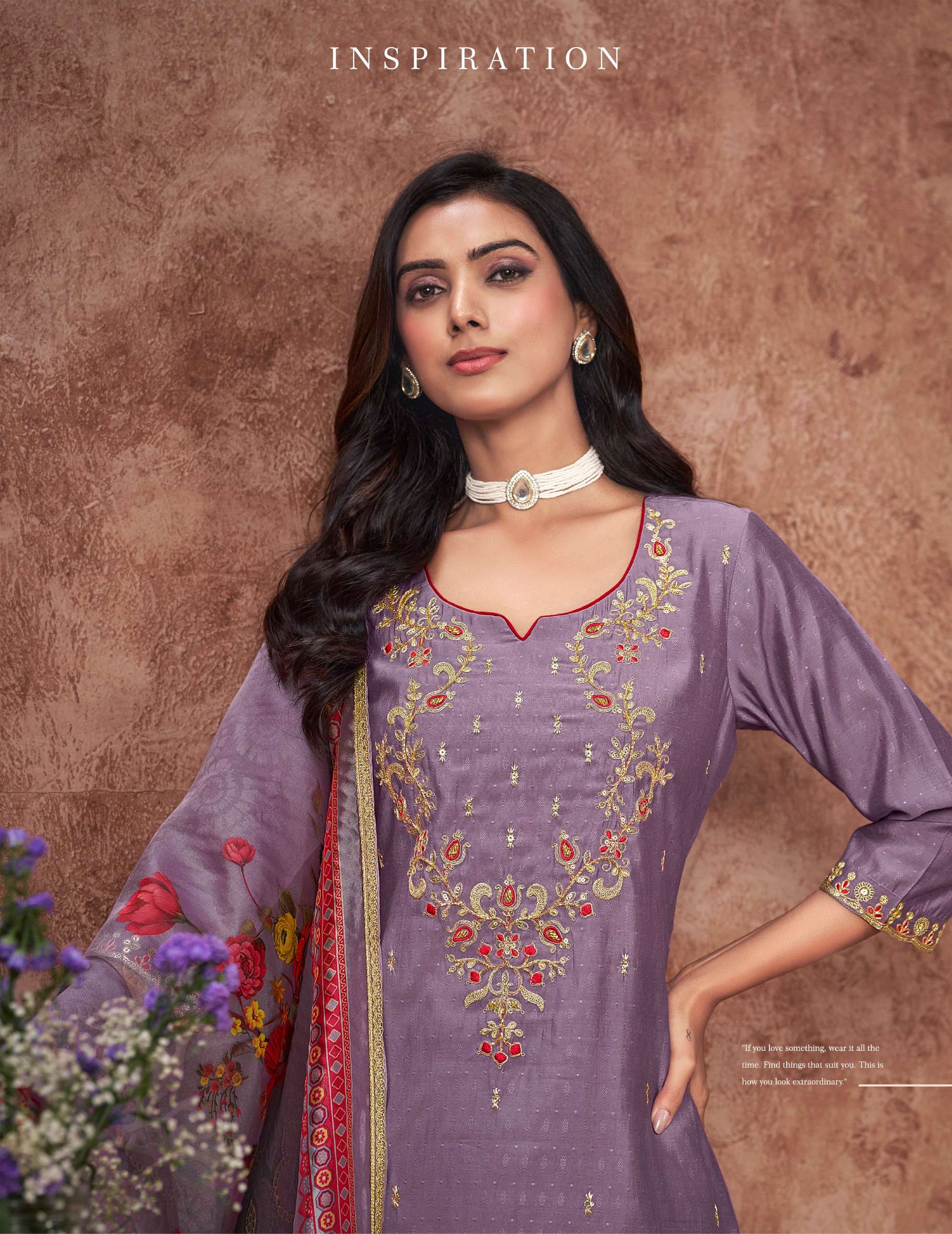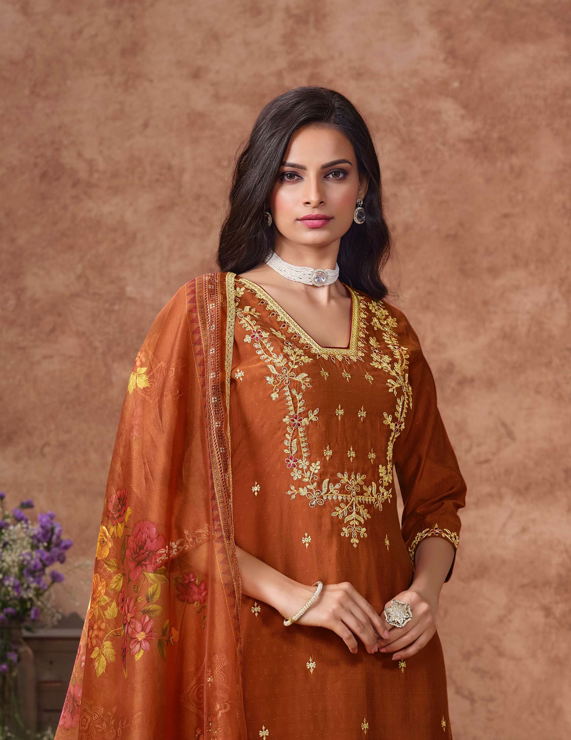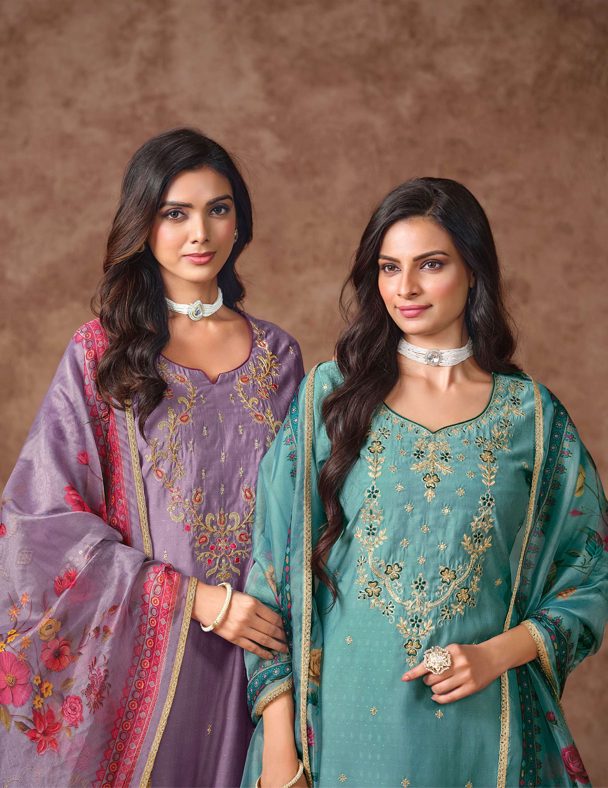 - *Top:* Embroidery work on viscose silk, embroidery lace on sleeve, and cotton lining. - *Bottom:* Viscose silk pant with embroidery work lace. - *Dupatta:* Digital print on organza dupatta with four-side fancy lace and tussle.