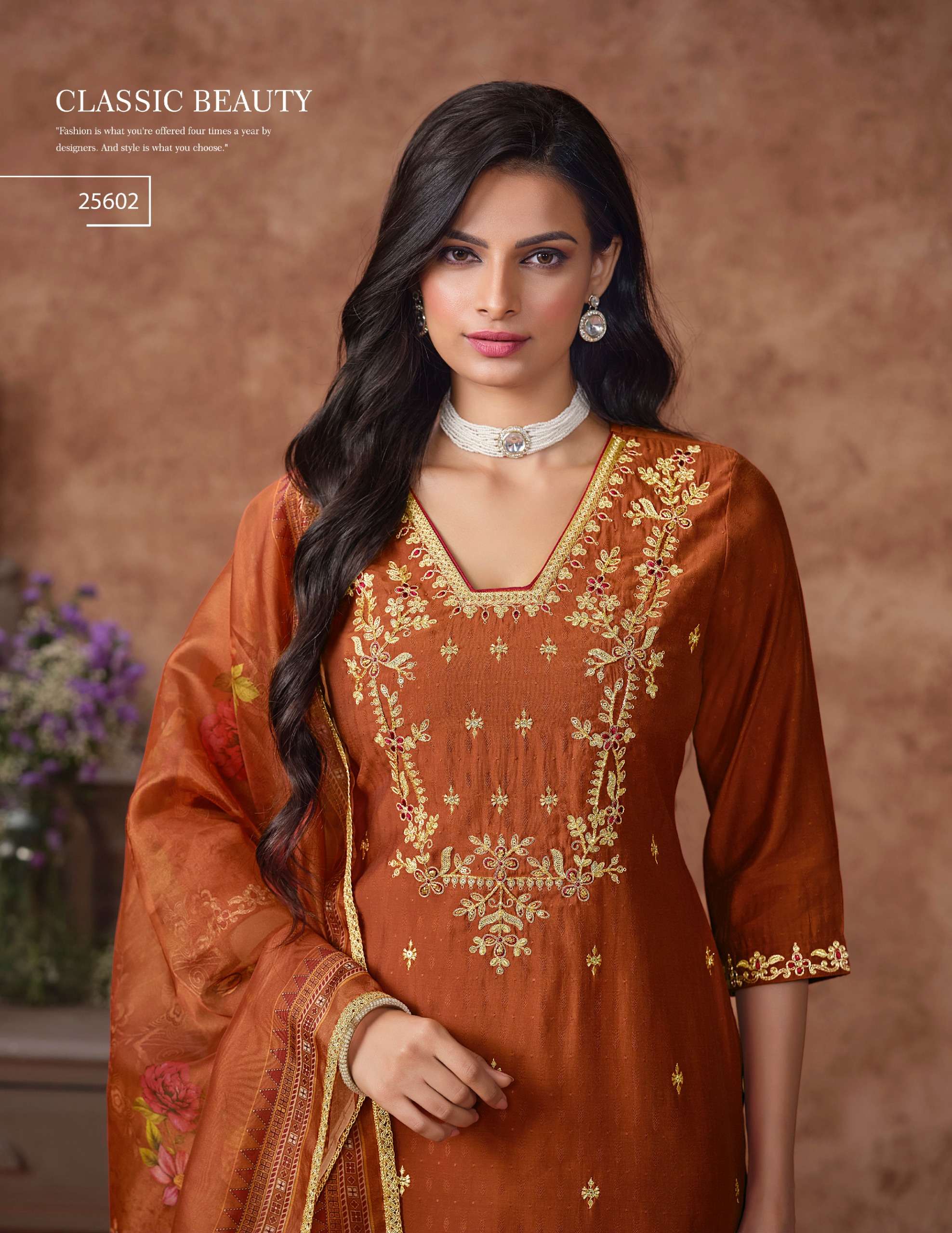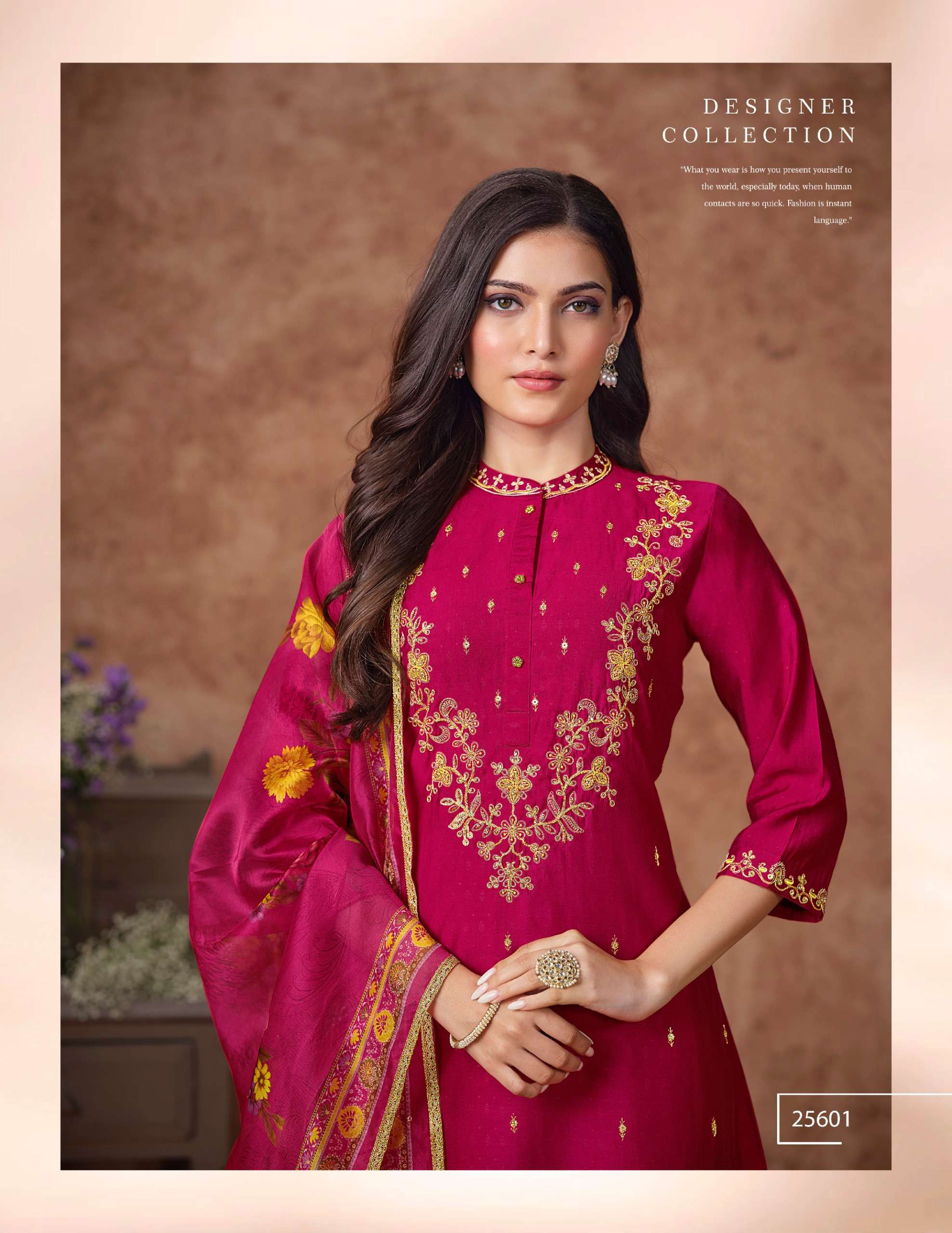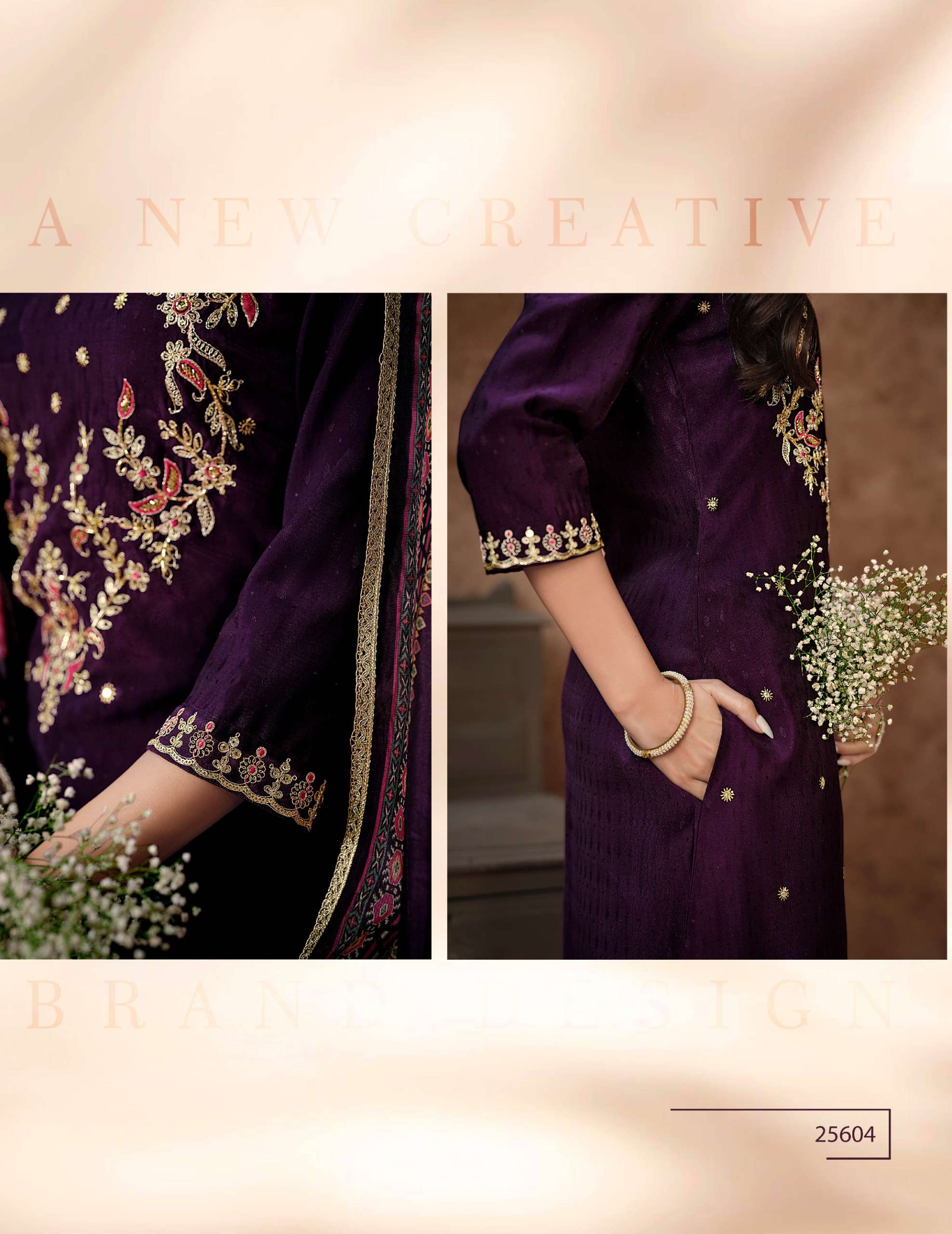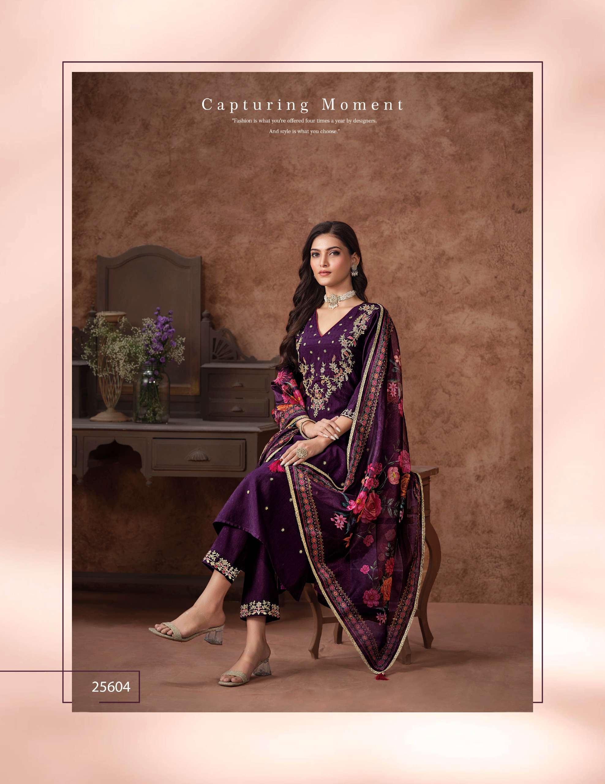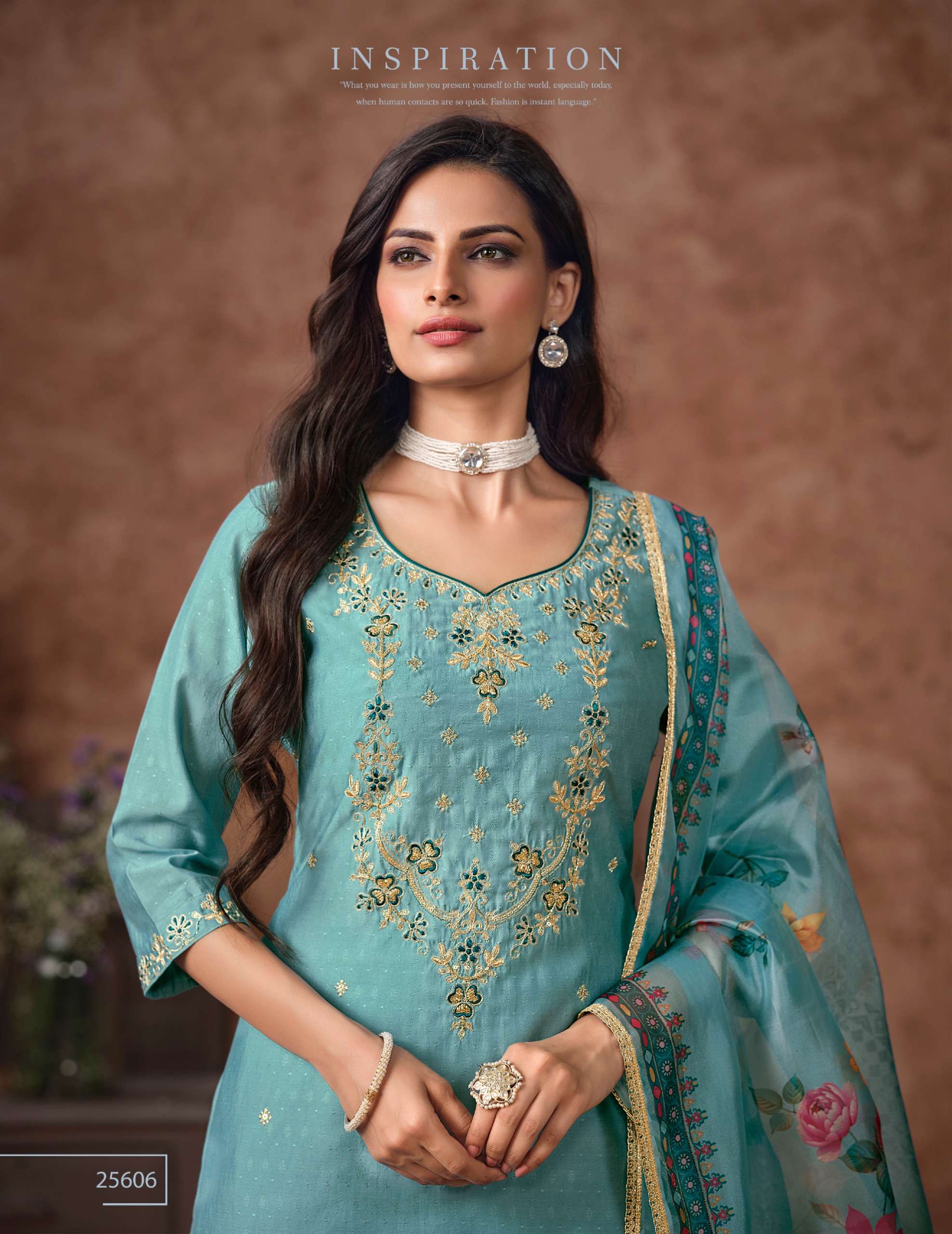 - *Top:* Embroidery work on viscose silk, embroidery lace on sleeve, and cotton lining. - *Bottom:* Viscose silk pant with embroidery work lace. - *Dupatta:* Digital print on organza dupatta with four-side fancy lace and tussle.