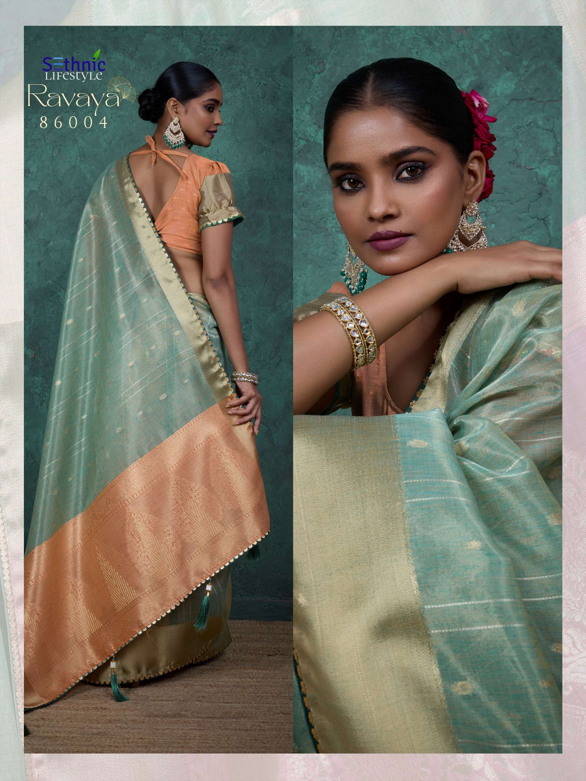 _*Ravaya* whispering sophistication in every fold — a linen blend saree with woven patterns that speak of tradition, lined with graceful piping, ornate lace, and tassels. A contrast blouse completes the story, with finely detailed weaving and sleeve patta._