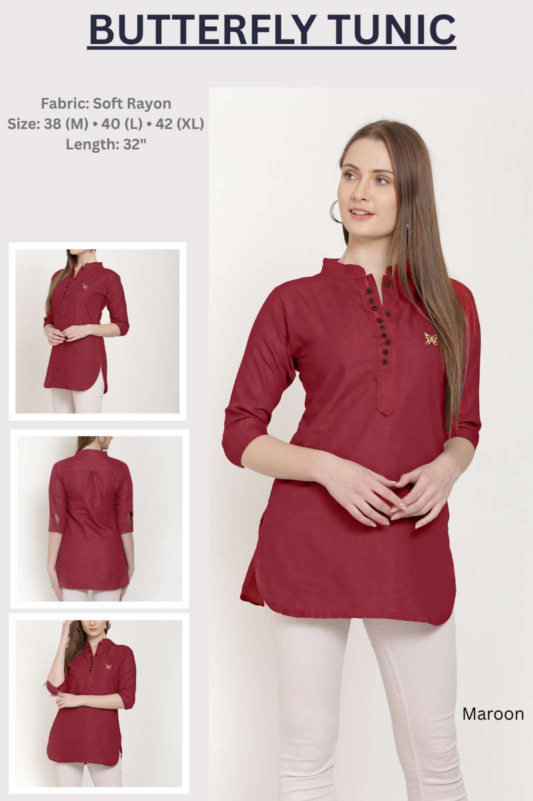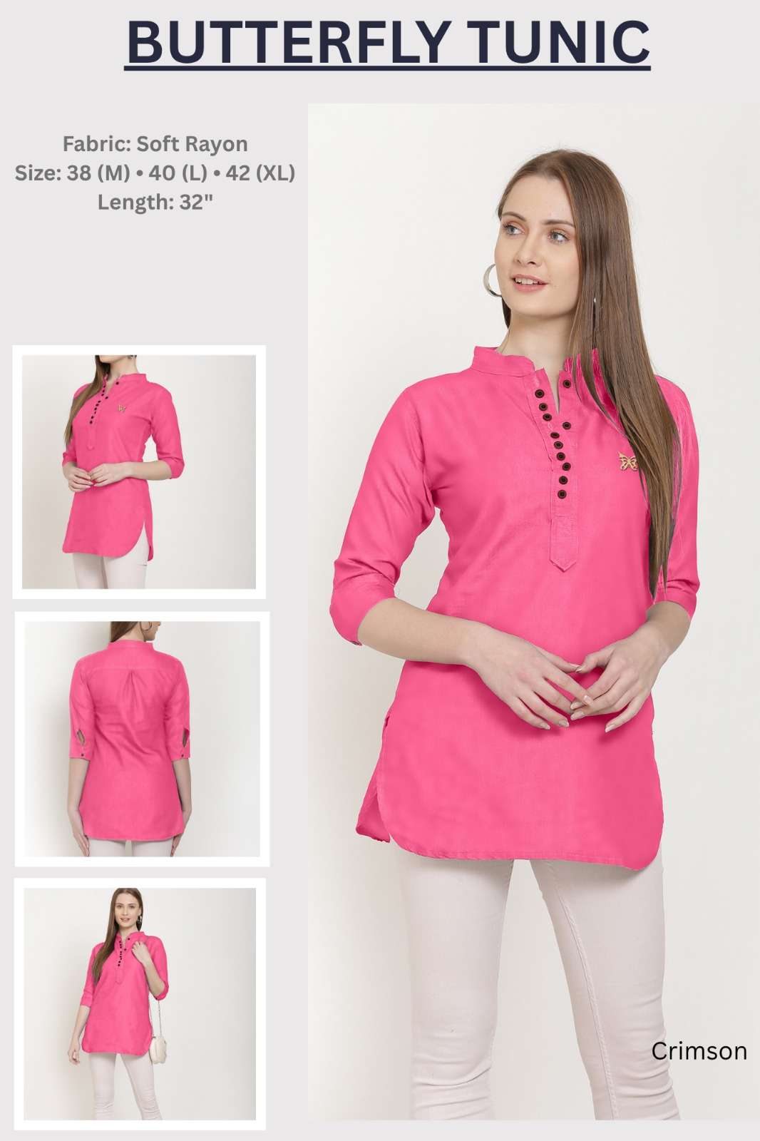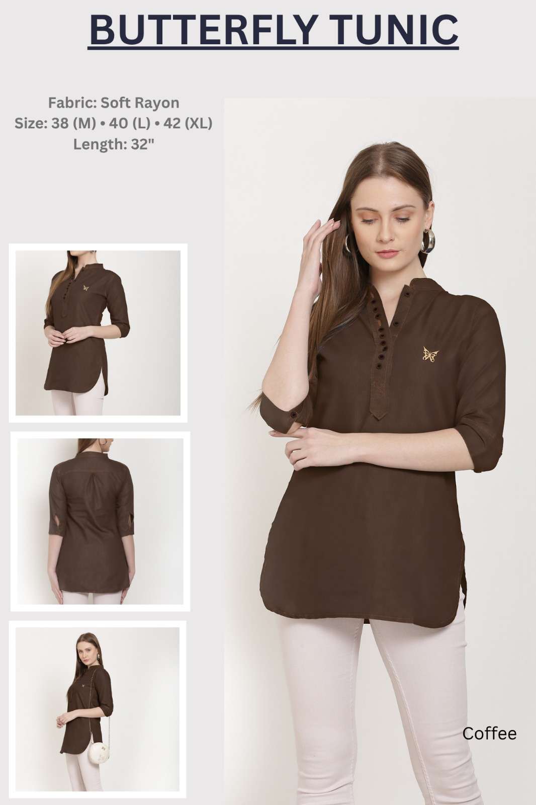 *RAYON BUTTERFLY TUNIC* *Fabric:* Premium Soft Rayon *USP:* Wooden Butterfly Badge *Size:* 38 (M) • 40 (L) • 42 (XL) *Length:* 32 inch