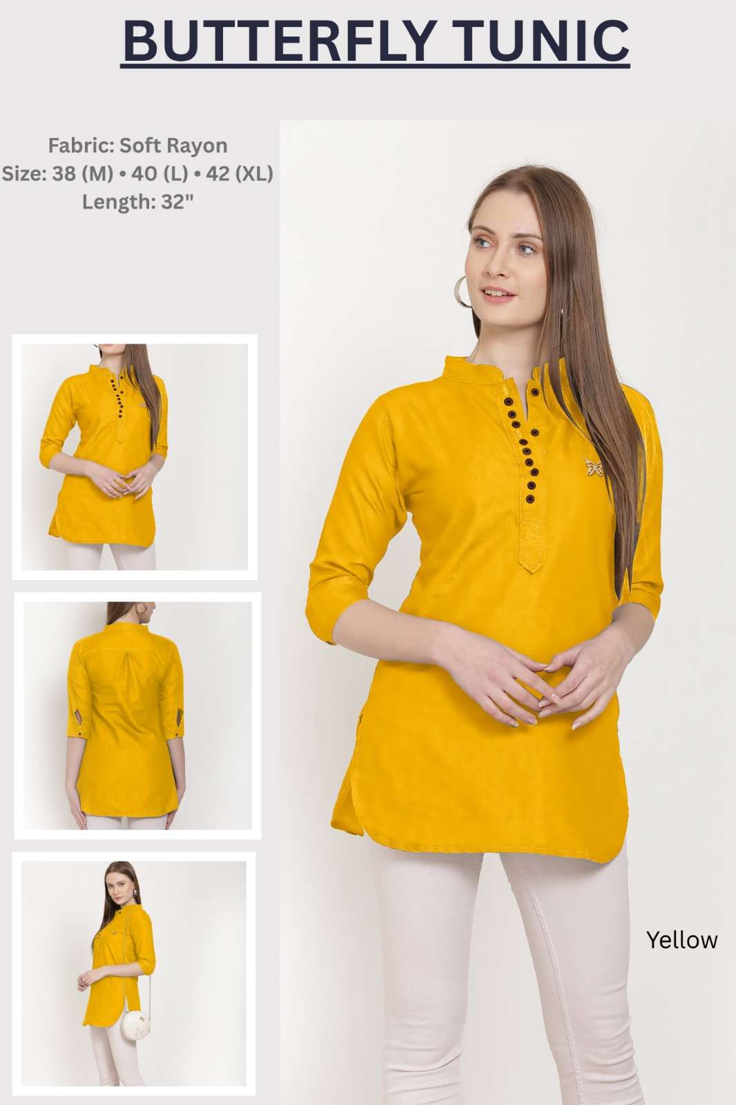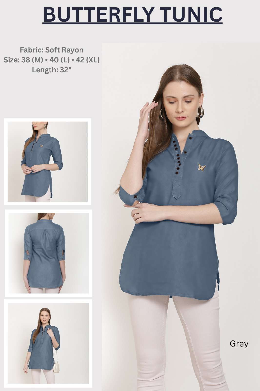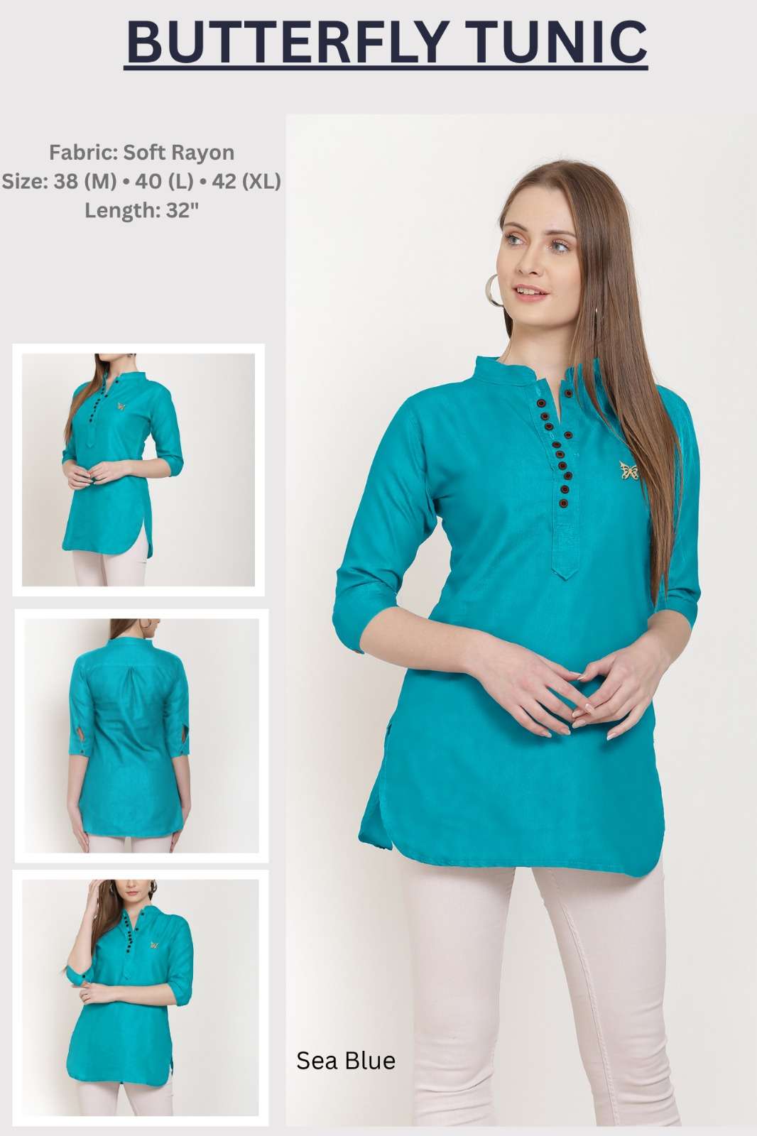 *RAYON BUTTERFLY TUNIC* *Fabric:* Premium Soft Rayon *USP:* Wooden Butterfly Badge *Size:* 38 (M) • 40 (L) • 42 (XL) *Length:* 32 inch