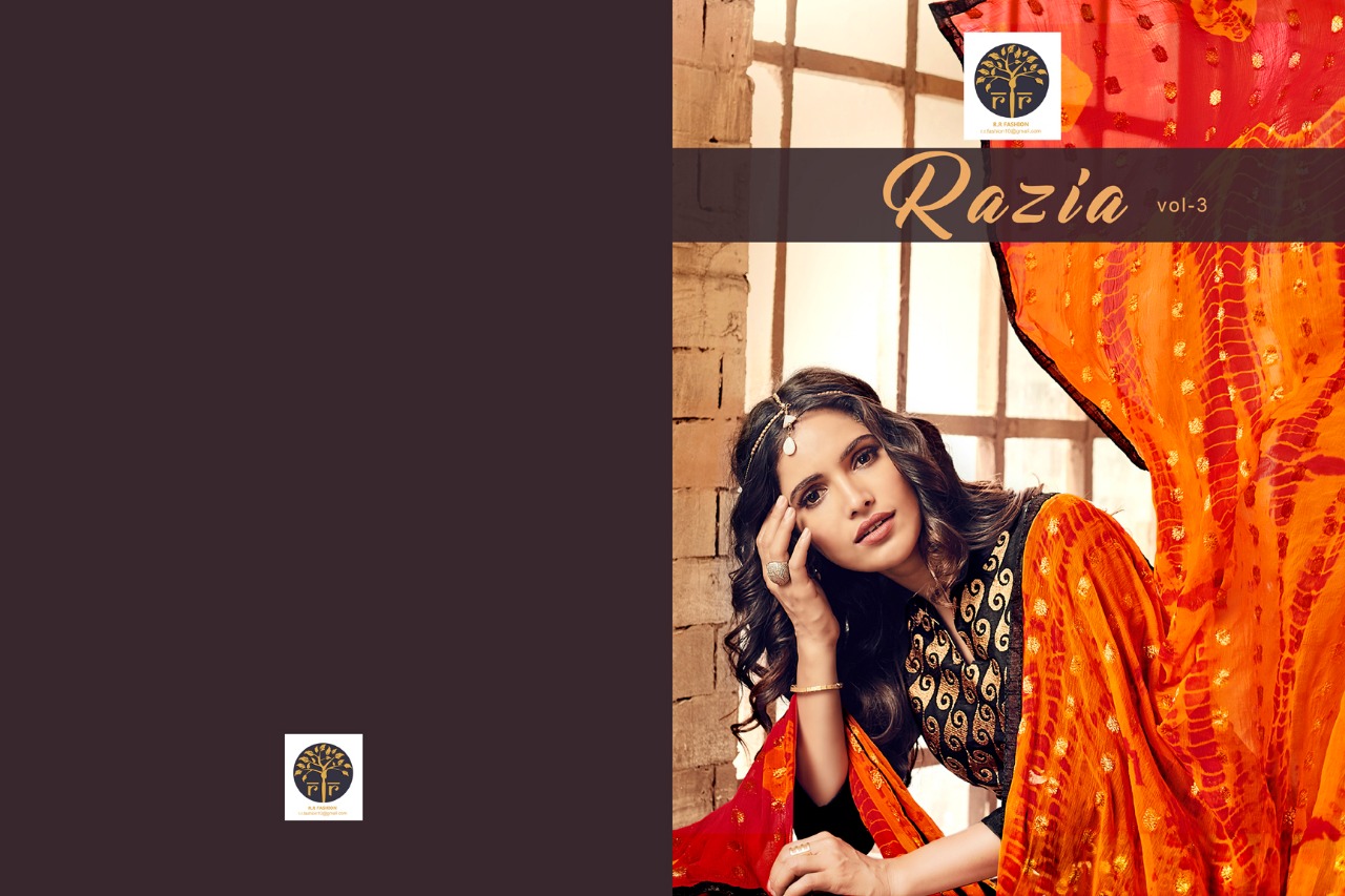 _R R FASHION_ *RAZIA VOL.3* by RR TOP:- BANARASI SILK WITH EMBROIDERY BOTTOM :- COTTON DUPATTA :-NAZNEEN JEQUARD WITH SABURI RATE :- 585/- Set to set . GST 5 Percent Extra. Delivery 2-3 days . |