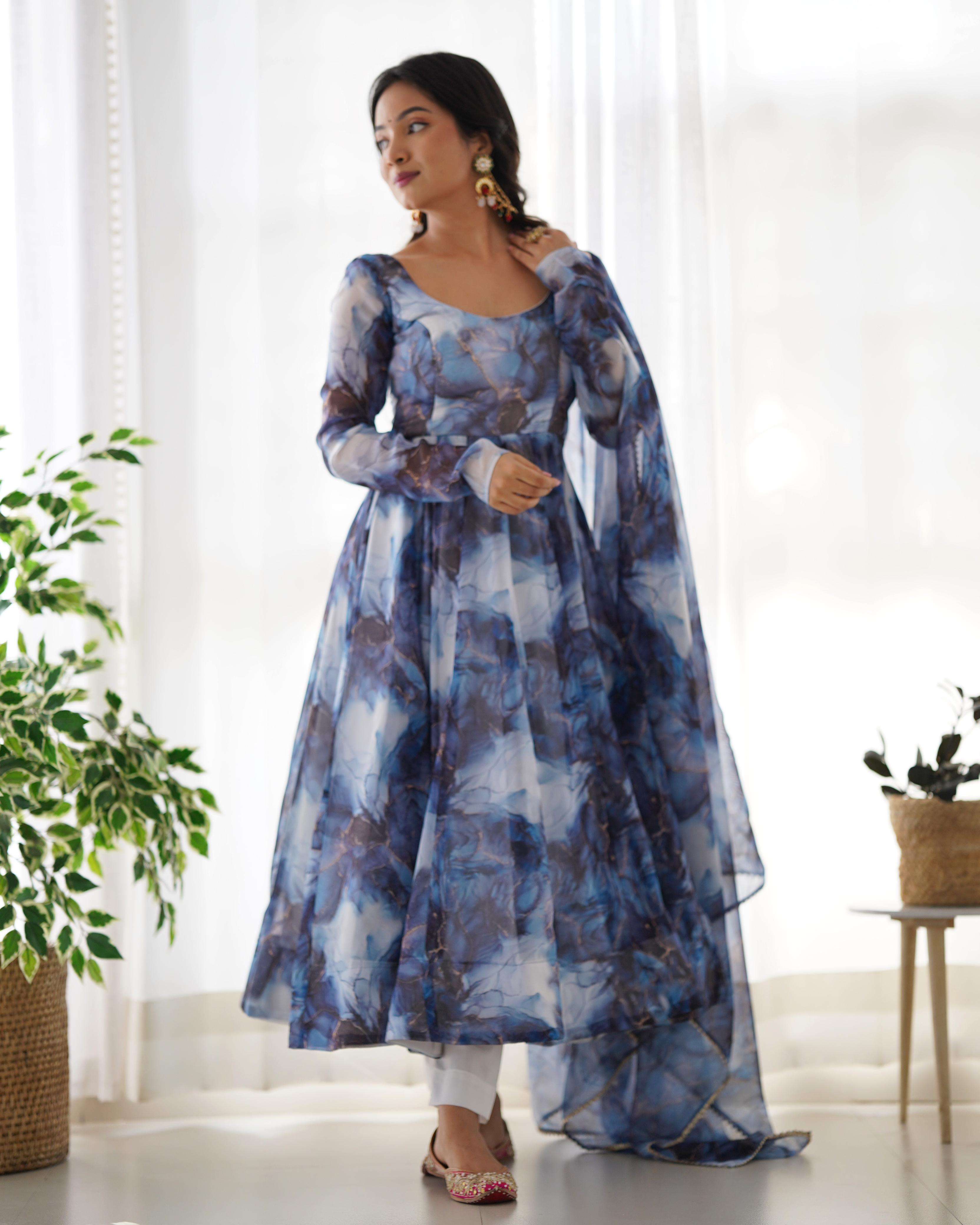 *REGISTERED TM PATENTED BY OWNER* *This colourfull lightweight & fresh look outfit is perfect for upcoming festivities and weddings which provides you more comfort and style* *PURE SOFT ORGANJA SILK MARBLE PRINT FABRIC FULLY FLAIR KALI PATTERN AND CANVAS PATTA WITH DUPPTA SET,PENT READY TO WEAR*