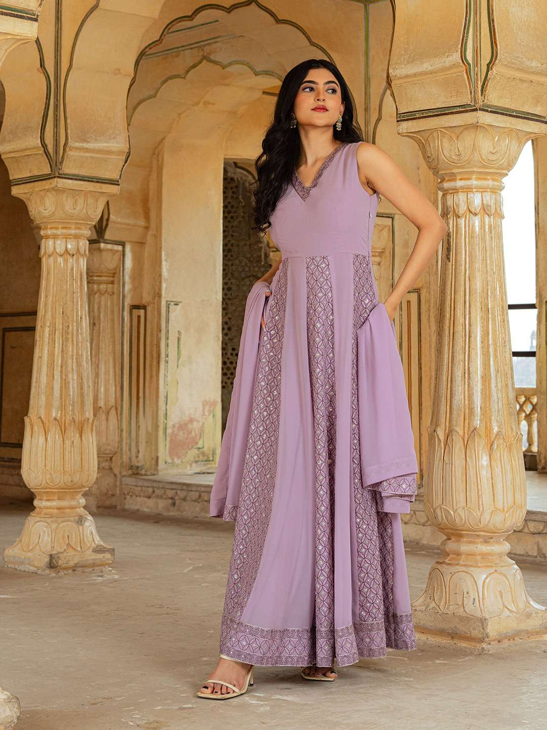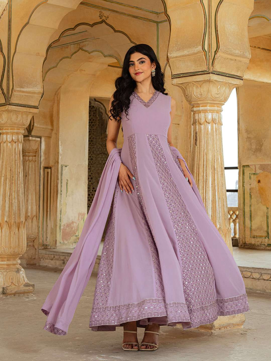 👗 GOWN DETAILS: * Fabric & Work: Georgette with Lucknowi Thread Embroidery ✨ * Sizes Available: XS(34"), S(36"), M(38"), L(40"), XL(42"), XXL(44") 📏 * Length: 56 Inches 📐 * Flair: 4 Meters 💃 * Lining: Full Micro Cotton Inner (Top to Bottom) 🧵 * Sleeves: Sleeveless ✨ * Neck Style: V-Neck ❤️ * Stitching: Fully Stitched with Canvas Patta ✔️