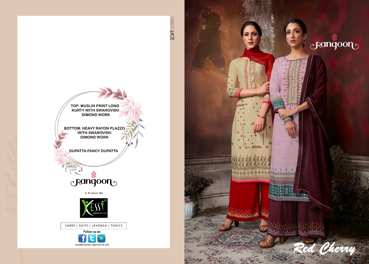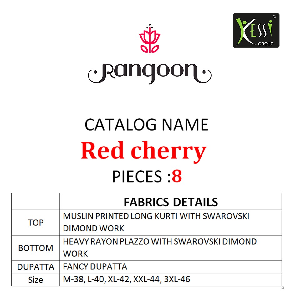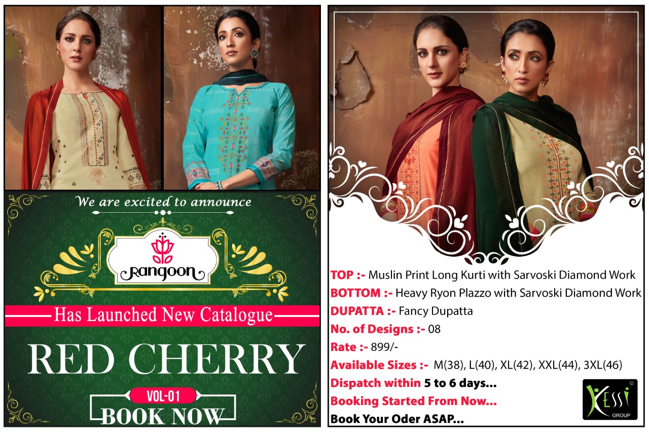 ? *Rangoon (Kessi Fabrics Pvt. Ltd.)* has launched _Catalog name_ : *Red Cherry* ? _Fabric Details_ ? ?Top:- Muslin Printed Kurti with Swarvski Dimond Work ? Bottom:- Heavy Rayon Palazzo with Swarvski Dimond Work ? Dupatta:- Fency Dupatta ?Total Design:- 8 ?Size;- M-38, L-40, XL-42, XXL-44,3XL-46 Rate. 899/- |