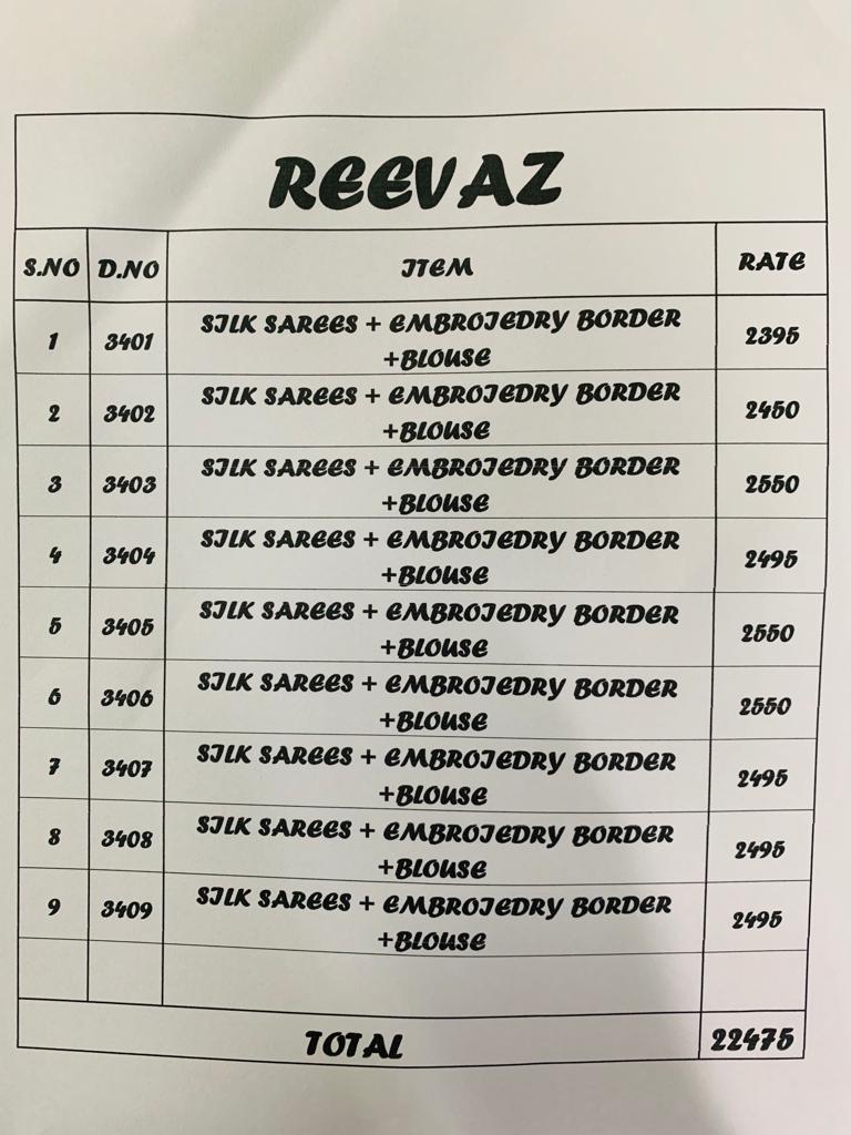 Brand - Shree Mathram. Catlog name - REEVAZ. Series - 3401 to 3409. * set & Loose & Singel* Single Extra 100 on company price list GST 5 Percent Extra. Delivery from tomorrow |