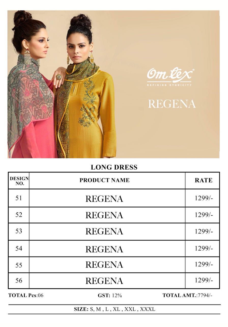 Buy Online Regena By Omtex Designer Ready To Wear Gowns Catalog With Printed Stall Wholesale Supplier And Dealer Nitya Nx Gujarat 6 Pcs of Full Catalogue at Wholesale Price. Looking for Regena By Omtex Designer Ready To Wear Gowns Catalog With Printed Stall Wholesale Supplier And Dealer Nitya Nx Gujarat Full Catalouge at Best Price? Buy Now Regena By Omtex Designer Ready To Wear Gowns Catalog With Printed Stall Wholesale Supplier And Dealer Nitya Nx Gujarat at Wholesale Rate of Rs 7794 with Total 6 Pcs from authroized dealer and supplier of OM TEX Brand. Cost of Each piece is just only Rs 1299 which is very low and affordable price to resale the product in your retail store ,This is Surat based Wholesale Supplier & Dealer of OM TEX Brand. Click on Brand name to Know more about OM TEX Brand's products.Call or Whatsapp on 9898838984 for booking or enquiry