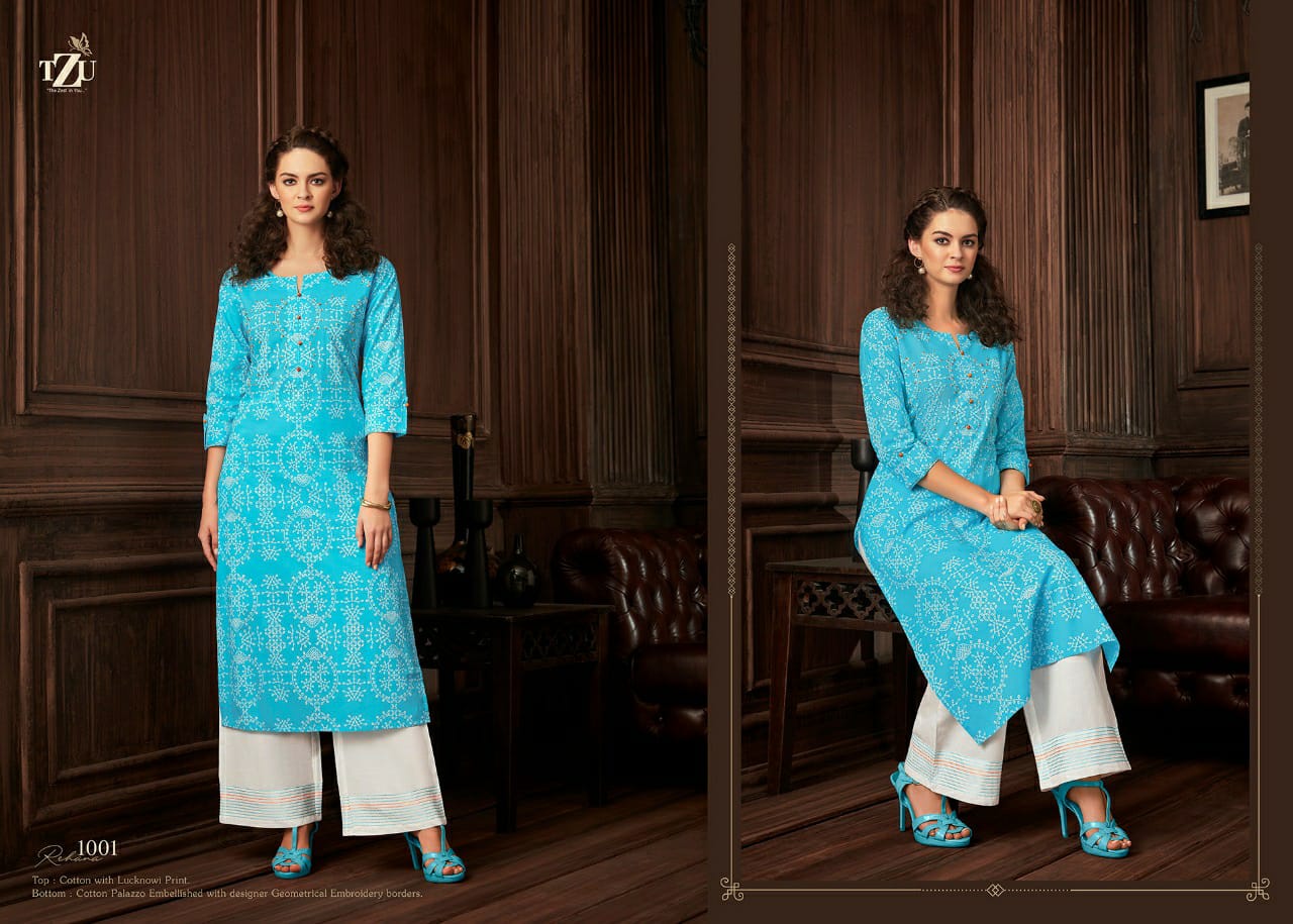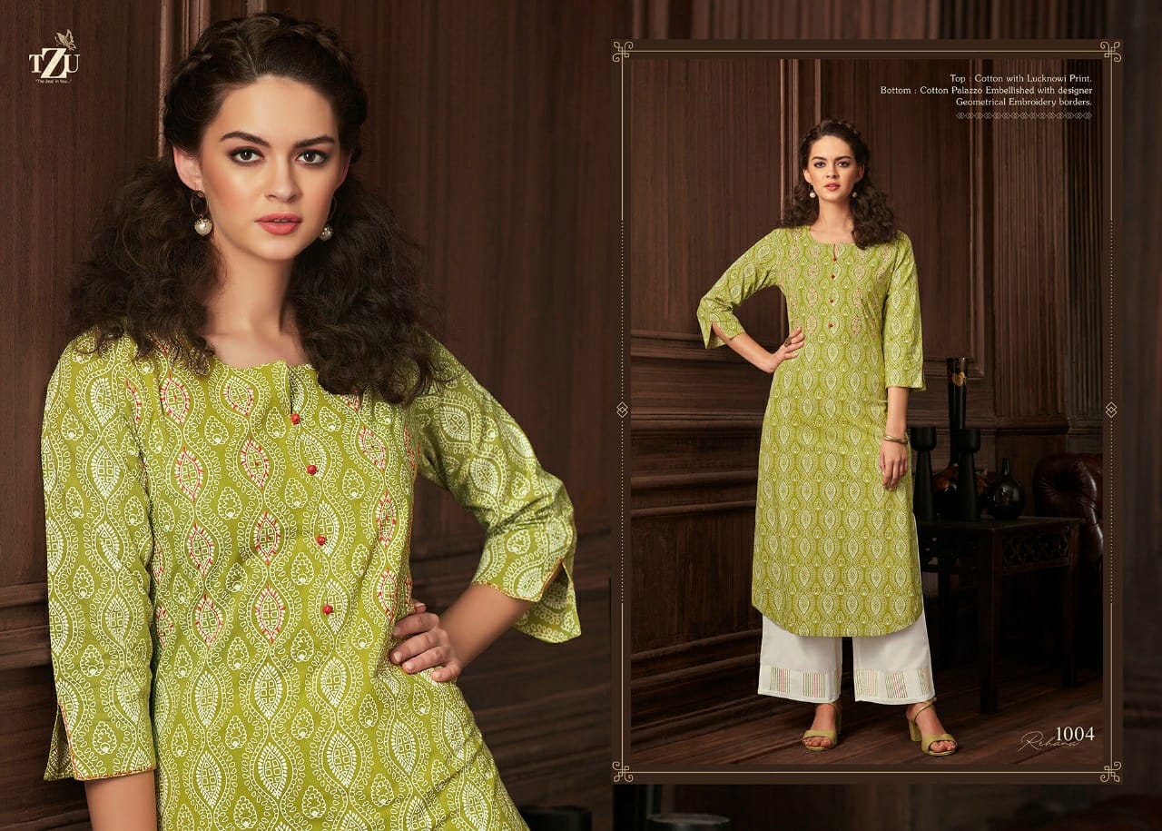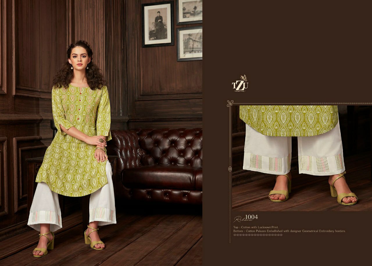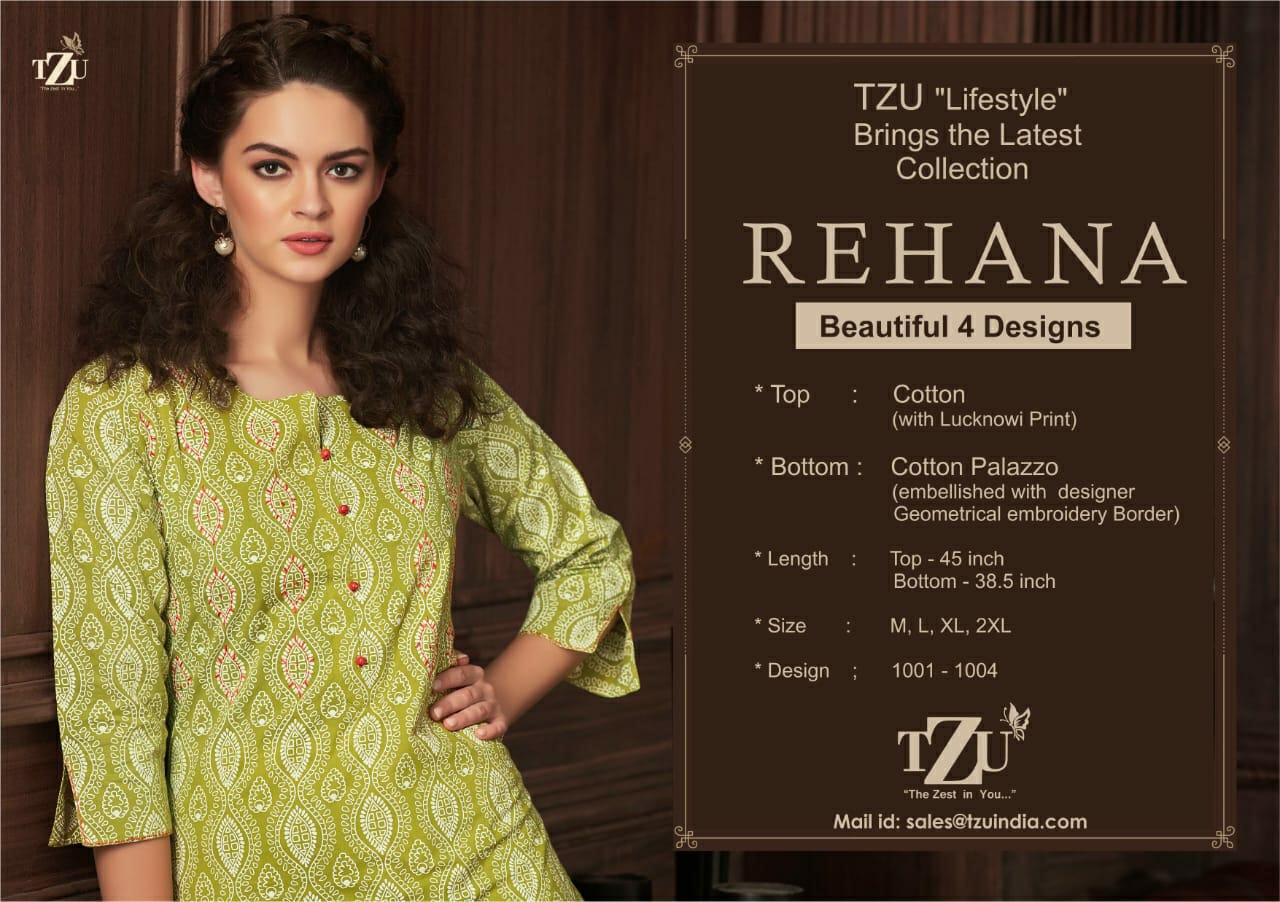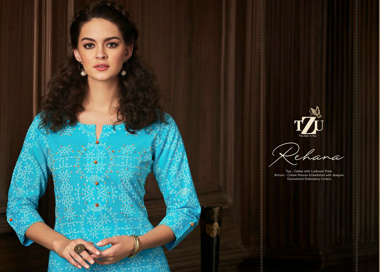 Buy Online Rehana Kurti With Plazzo By Tzu Manufacturer And Dealer From All Over India 4 Pcs of Full Catalogue at Wholesale Price. Looking for Rehana Kurti With Plazzo By Tzu Manufacturer And Dealer From All Over India Full Catalouge at Best Price? Buy Now Rehana Kurti With Plazzo By Tzu Manufacturer And Dealer From All Over India at Wholesale Rate of Rs 3168 with Total 4 Pcs from authroized dealer and supplier of Brand. Cost of Each piece is just only Rs 792 which is very low and affordable price to resale the product in your retail store ,This is Surat based Wholesale Supplier & Dealer of Brand. Click on Brand name to Know more about Brand's products.Call or Whatsapp on 9898838984 for booking or enquiry